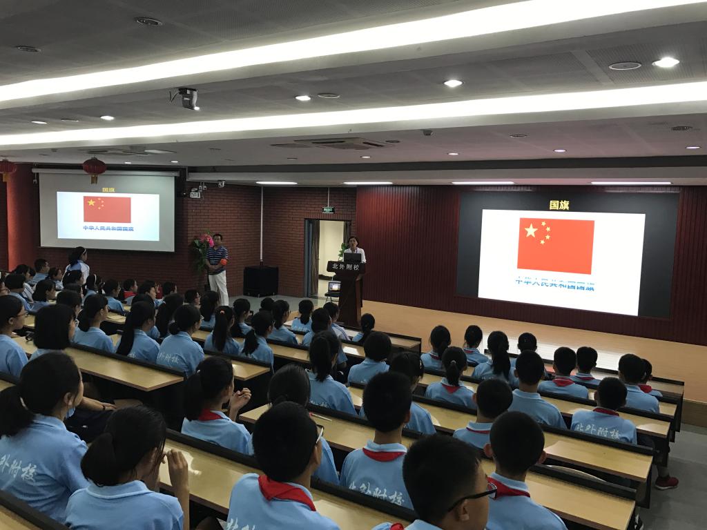 在嘹亮的国歌声中,爱国、爱校教育画上了圆满的句号。让学生对祖国、学校的热爱,从唱好国歌、校歌开始,从点滴做起,一步一步去实现,We are young! we will fly! 让梦想在北外附校绽放!