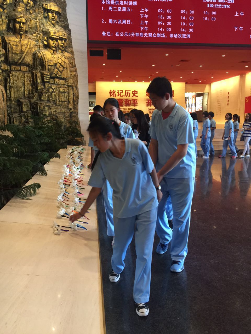 进入纪念馆,同学们将亲手制作的白花捐献雕塑前以示敬意。在解说老师的带领下,我们依次参观了七个展厅。从日本在19世纪末对中国的蚕食,到九一八事变,到七七事变,到长城抗战,再到淞沪会战,再到国共合作共同抗日,再到敌后根据地建立......这一一张张黑白照片向我们诉说着中国抗日战争的艰难历史。从天津无差别轰炸,到南京大屠杀,到日军三光政策,再到731部队生化战细菌战。这一个个不堪回首的事件揭露了惨无人道的侵略者在中国大地上的暴行,让我永生难忘!从张自忠到左权,到傅作义,到佟麟阁,到赵一曼,再到无数为抗击侵略者而英勇的献出生命的战士们。他们都给予了我巨大的鼓励。正是这些人,让人们熬过了艰苦卓绝的抗日战争;正是这些人,让我们得以今天幸福的生活在和平世界;正是这些人,让中华民族屹立在世界,永垂不朽!
