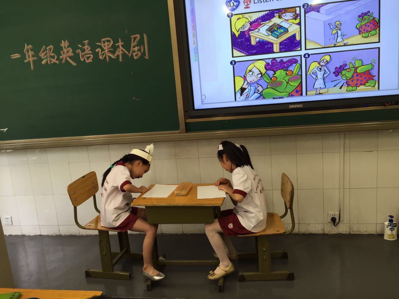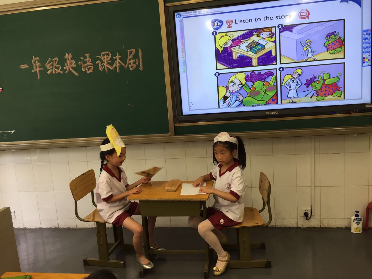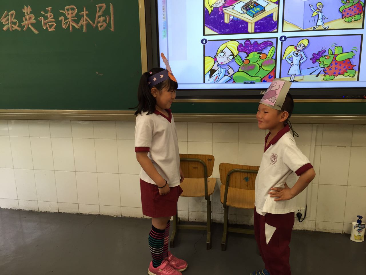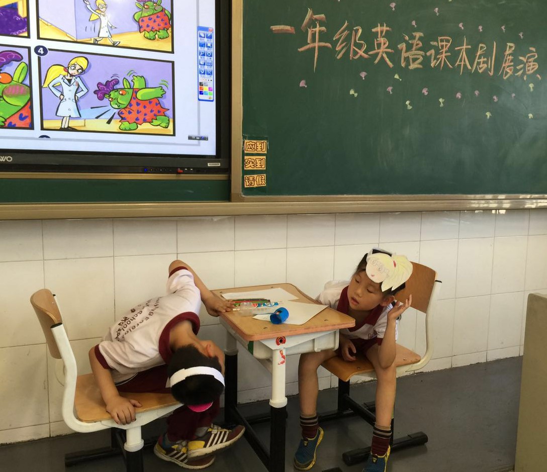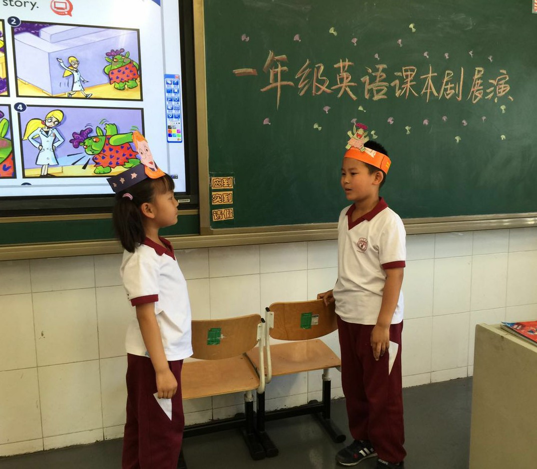 2016年5月小学一年级英语备课组举行课本剧展演。这次活动旨在通过小组合作、角色扮演等形式帮助孩子巩固学过的语言点,让学生感受英语学习的乐趣。课本剧展演不同于以往的朗诵比赛,能让更多的学生有参与、合作、交流和能力的展示。本次剑桥国际少儿英语课本剧的表演活动可谓是异彩纷呈,同学们全员参与,自己分组,讨论角色分配,自主排练,干劲十足。别看一年级的同学们刚刚入校,年纪最小,可搞起活动来真是潜力无穷,令人惊叹!一星期前,他们就开始陆续准备道具了呢。