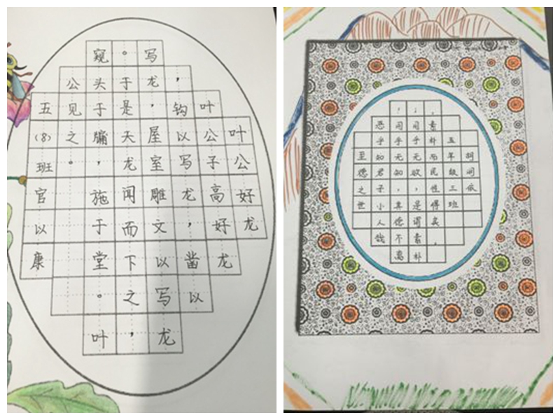 比赛中,教室里寂然无声,孩子们一个个全神贯注,一丝不苟,在小小的方格之间挥洒书写国学之经典。有书写一心追求自由逍遥的哲人庄子;有书写字词简练,寓意深刻的文言文;有书写字词优美、对仗工整的古诗……短短的一节课的时间里,孩子们却能尽情地在国学经典的河流中畅游……再看那一个个字形挺拔、布局合理、美观大方的中华汉字在孩子们的巧手中瞬间跃然纸上,字字刚劲有力、笔画流畅,充分彰显了孩子们对中国传统文化方面的良好修养,继承和发扬了我国书法传统艺术,处处弘扬了孩子们的爱国主义精神,更代表了他们良好的学习习惯和热爱中国书法的精神。书写完毕,孩子们又精心调配了各种色彩,独具匠心地在作品的周围画出了不同风格的图案。短短的四十分钟,一幅幅、一张张精美的作品展现在我们的眼前,令人情不自禁地发出了由衷的赞叹。