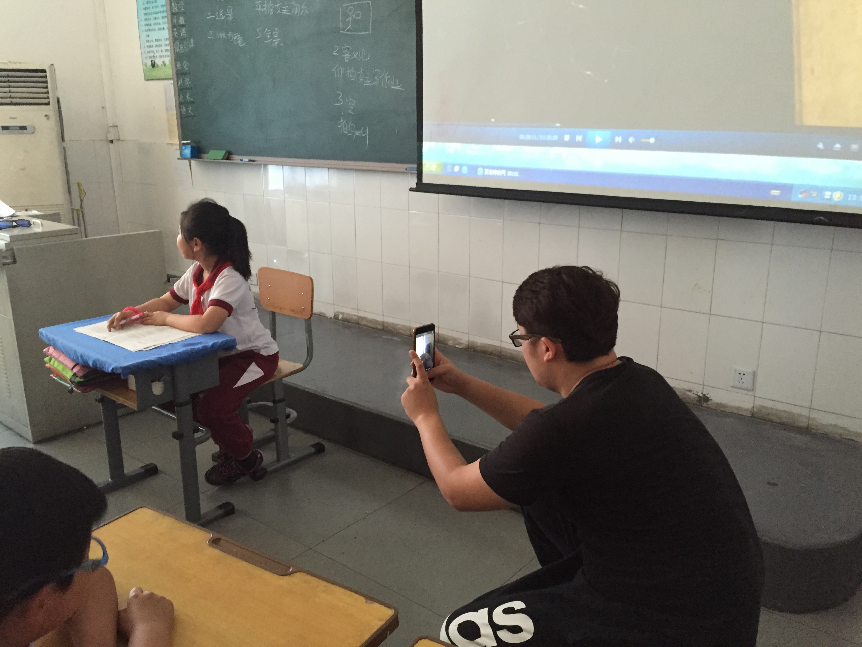 最后,小杨老师给同学们演示了如何用简单的手持设备——苹果手机拍摄一组镜头,并通过手机的软件剪辑,表现一个小情景:正在写作业的小女主角忽然听到了窗外的鸟鸣。随机挑选的小演员涂佳同学表现相当专业,镜头一次通过,编辑后的画面自然流畅!