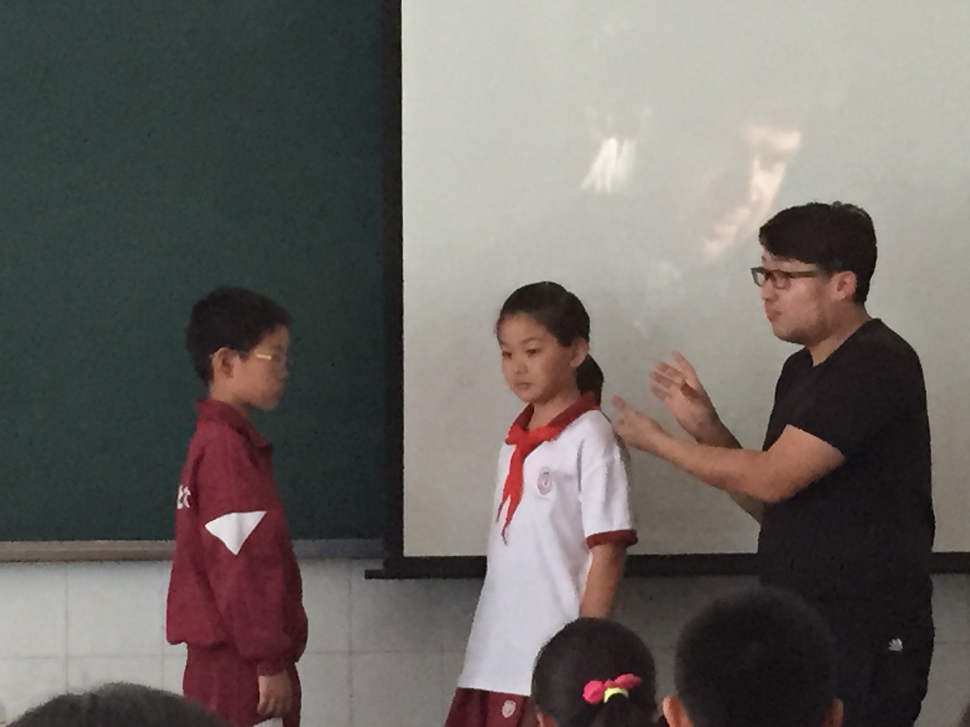 这位阳光帅气的小老师名叫杨松。上课铃声一响,他就与同学们积极互动,课堂气氛一下子活跃起来。小杨老师首先利用教室的多媒体给同学们播放了电影《夏洛的网》中的一个小片段,又精心选取其中有代表性的画面,逐个讲解每个镜头的名称、用处。然后请同学们到讲台上演示。通过讲解,孩子们逐步明白了几种常用的拍摄方法,比如“正打”、“反打”、“全景”,也初步掌握了使用客观镜头、主观镜头、空镜头等电影的叙事方式。