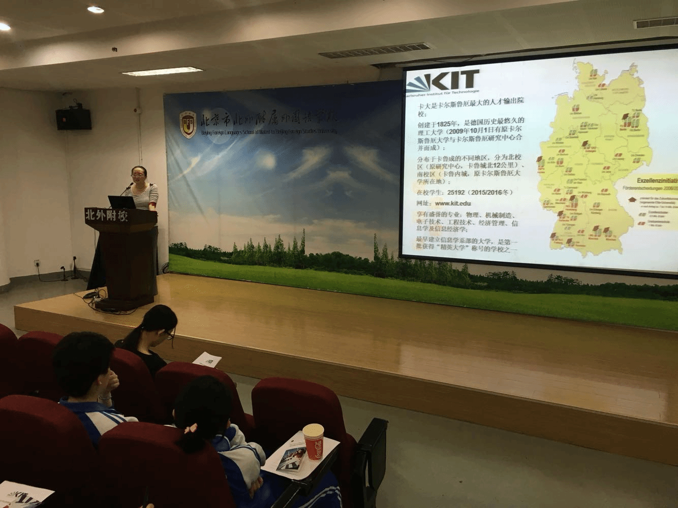 2016年5月19日,我校举行德国卡尔斯鲁厄理工学院招生宣讲会,来自卡尔斯鲁厄理工学院驻北理工专业测试点的负责人李慧坤博士也来到我校,为高中校区德语学生进行宣讲。