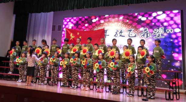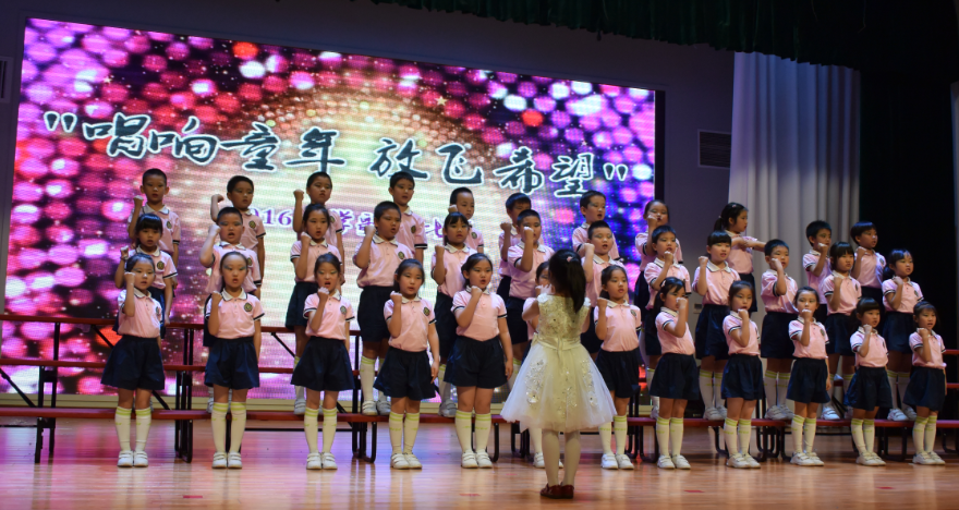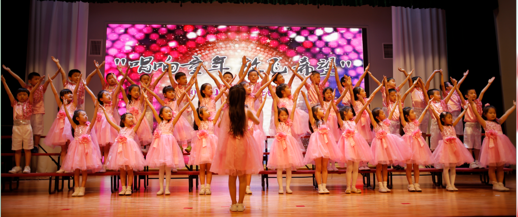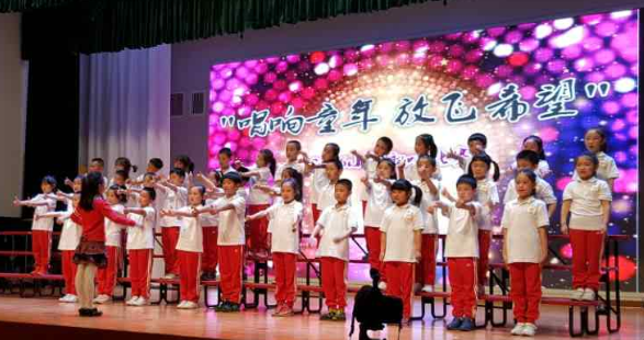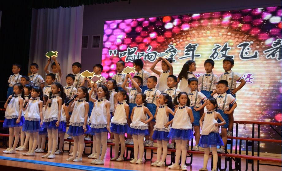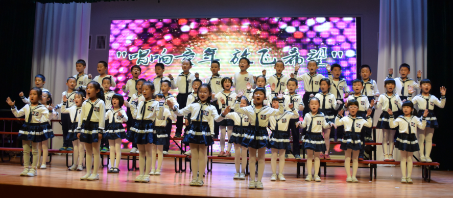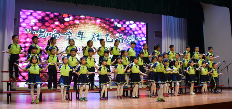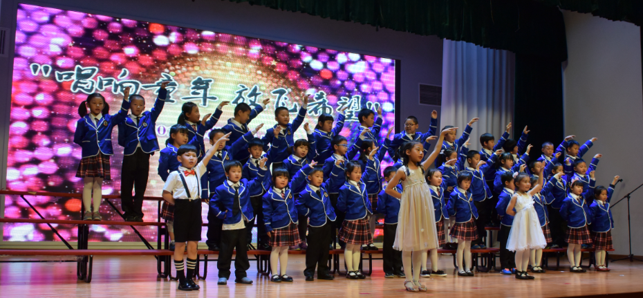 首先,四名小主持人上场,充满激情地朗诵,五月的鲜花盛开在北外附校,五月的百灵唱出婉转悠扬曲调。五月我们徜徉在音乐之海的怀抱。我们唱出幸福------童年的美好,我们唱出坚毅-----长大为国立功劳,我们唱出自信----明天会更好!