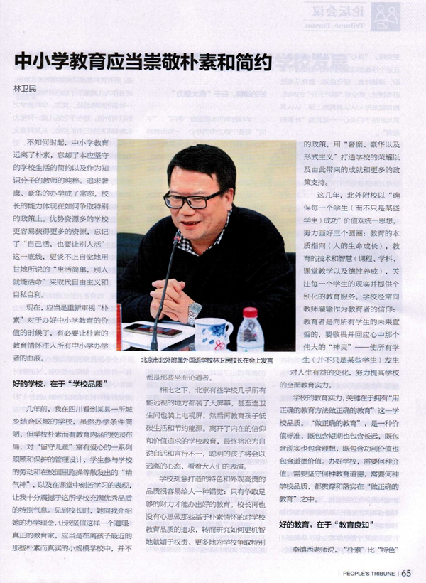 近日,《人民论坛》杂志2016年5月刊全文刊登我校校长林卫民文章——《中小学教育应当崇敬朴素和简约》。
