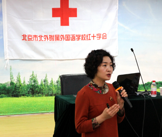 讲座中,刘东冬重点介绍了海淀区红十字会学校工作委员会的相关工作。刘东冬介绍到截至目前为止,海淀区已经有3所全国红十字模范校,31所北京市红十字示范校。她表示海淀区红十字工作与学校德育、教学工作有着很多契合点,并指出海淀区学工委的学校红十字会活动正在日益变得完善,“北京十六区县看海淀,全国看北京”这不仅仅是一个口号了。随后,她还为全校师生介绍了学工委在学校红十字会活动中的主要工作:健康教育、救死扶伤的募捐工作、急救培训、志愿服务。同时,刘东冬提到2016年海淀教育系统红十字急救师培训班,作为全市第一批教师急救师,海淀区承担了这个重任。我校初中校区副校长许祥也入选了该培训班,并将进行为期一周的培训。。