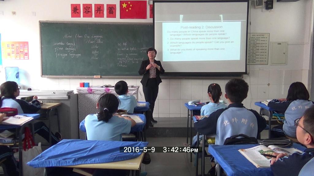 两位老师上课的内容均为初一年级剑桥第九单元第一课时的阅读课——More than one language。彭老师以前一天母亲节用六种语言说“我爱你”作为导入,引起了学生的兴趣,活跃了课堂气氛,并引出了本堂课的话题。引导学生观察文章图片获取信息,使学生学会预测文章大意——关于生活在沃佩斯河附近的印第安人讲多种语言的介绍。通过对文章的速读和细读,学生了解了当地人的母语Tukano这种语言,并且明白了为何印第安人会讲多种语言。学生学会了通过速读查找信息,通过细读对文章事实、细节进行理解和判断这一阅读策略,并通过长难句的分析解决了学生理解的问题。读后的活动中,学生讨论了为什么越来越多的人学习英语,以及为什么现在的人不仅学一门外语。通过讨论,学生明白了外语学习的重要性,懂得了“The limits of my language are the limits of my world”这一道理,相信在以后的语言学习中学生会增添更多的动力。