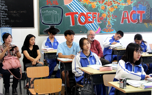 上午九点半,美国访问团在209会议室与高中部英语教师代表进行会面。我校将目前高中部三个年级的国际班情况与之交流,并表示出学生对于赴美国留学的渴望与热情。Jon博士对美国蒙赛罗大学进行介绍,表示该大学多年来致力于培养媒体艺术和设计,科技和商业行业的专业人才。国际部赵主任介绍了该学校的录取标准、人才要求等具体信息。随后,该美国访问团赴高二PGA班进行听课。外教Marcus的读写课:“关于青少年犯罪现象的探讨”赢得了访问团的一致好评。学生积极地参与度,高水平的交流让访问团觉得整节课“特别舒服”,也充分肯定了我校外教课与学生的英语水平。