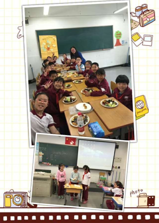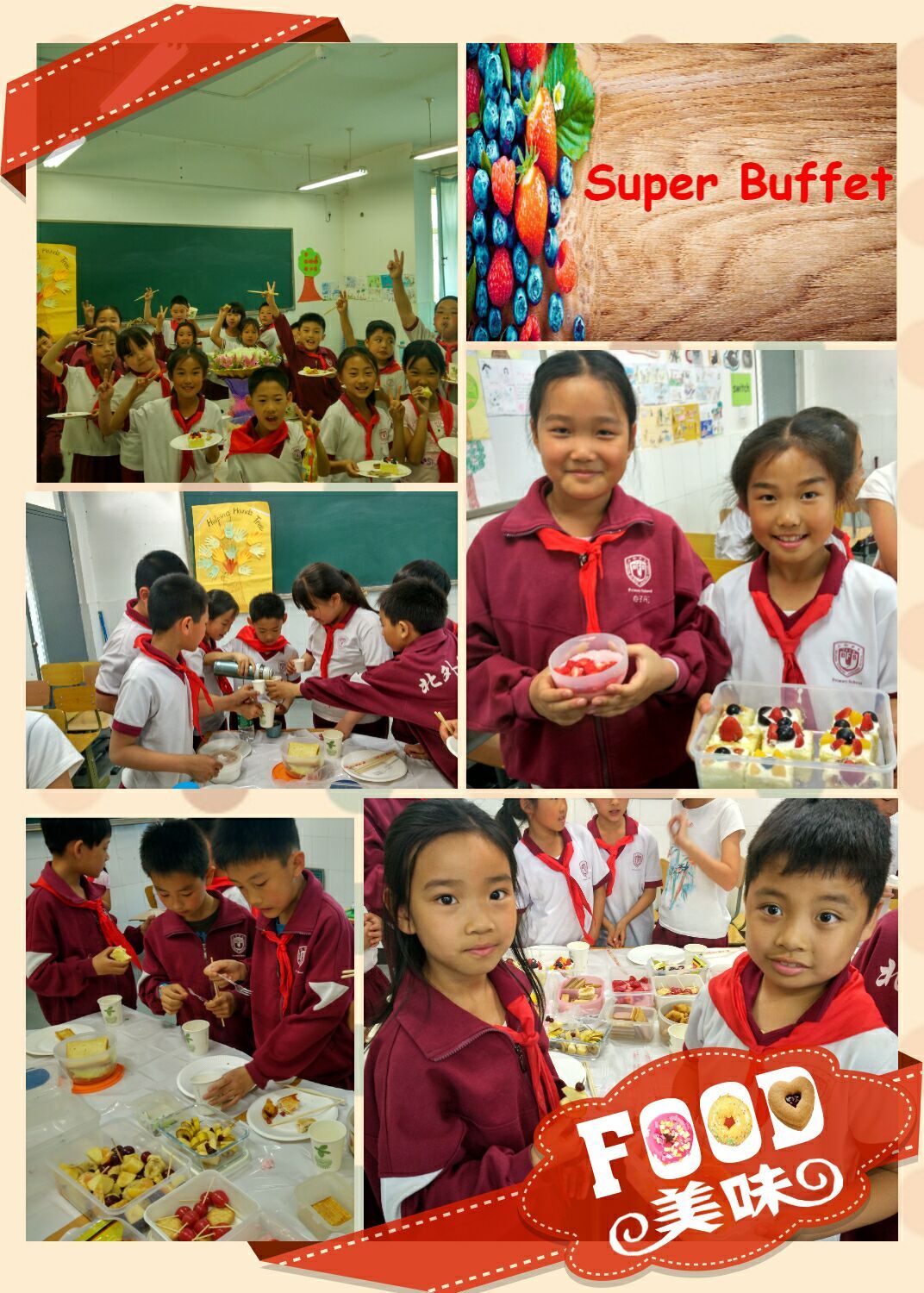 2016年4月29日,小学三年级部英语备课组以校本课程单元 A World of Food为背景,开展主题为“Super Buffet”的冷餐会活动。学生们将自制的零食、甜点带到学校与同学交流制作方法并分享美食。整个学科实践活动分为Show Time和 Eat and Enjoy两个环节。