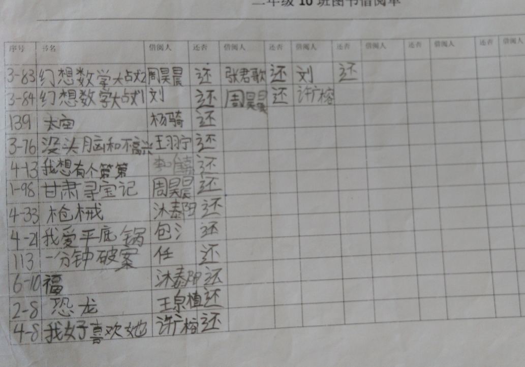 为了充分发挥图书角的作用,二年级各班根据本班的实际情况制定了班级图书借阅制度,并配备了图书管理员负责图书的管理及图书的借阅。语文老师对学生阅读提出具体要求和指导,促进增加学生的阅读量,让每一个学生有书读,让他们每天生活在书香中。