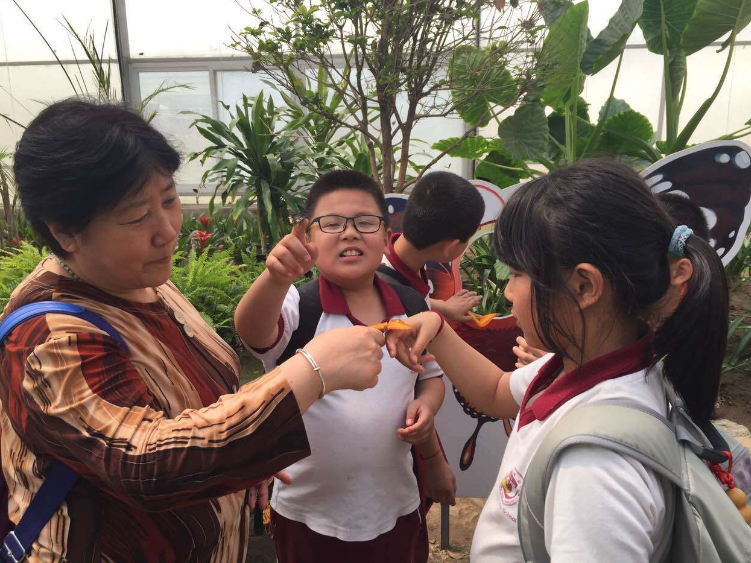 “七彩蝶园”是亚洲最大的活体蝴蝶观赏园,是以蝶为主题的科普教育基地。在这里,同学们穿过七彩风车长廊,来到蝴蝶世界。色彩缤纷、姿态万千的蝴蝶在同学们身边飞舞,时而小息在同学肩头,时而在同学四周环绕,引起大家一阵阵惊叹。近距离观赏蝴蝶,与蝶共舞,同学们认识了蝴蝶的四种虫态,了解它的变态过程以及生活习性。