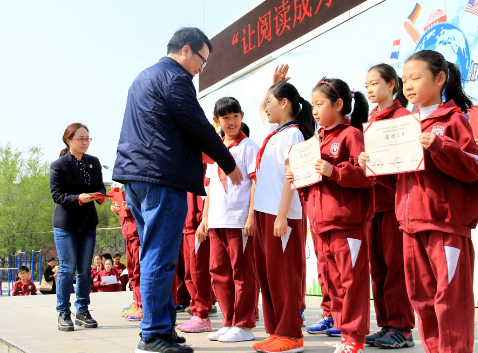 图为4月11日,附校第八周升旗仪式上,尊敬的林校长亲手为获得北京赛区金奖的同学颁奖。