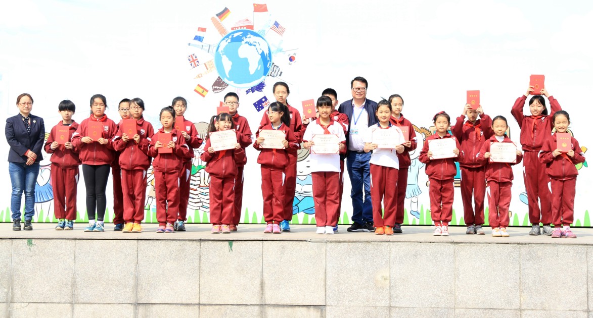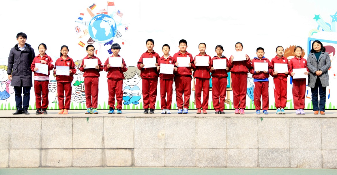 随后,大队辅导员席心如老师公布了师生获奖情况:(1)我校小学校区英语短剧在2015外研社·亚马逊杯“我是书虫”阅读漂流活动分别荣获:北京赛区金奖(四年级 曾一娜&许钰超然)、北京赛区银奖:(三年级 雷喻濛 & 孙午琪;六年级 徐黛岚 & 陶然)、北京赛区铜奖(三年级 胡馨予 & 宋羽高;五年级 李沛旻 & 周冠霆; 高玺洋 & 周静姝)。(2)我校两支DI参赛队在北京市DI创新思维比赛中均荣获北京市比赛二等奖。