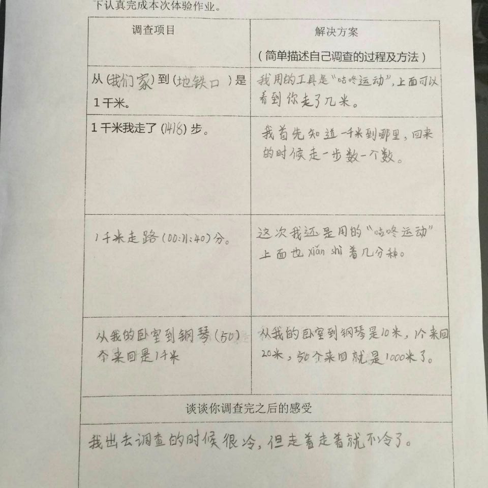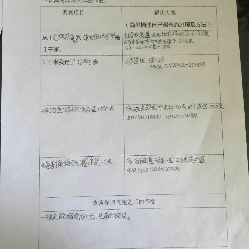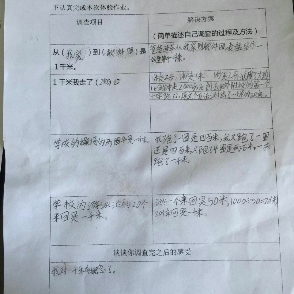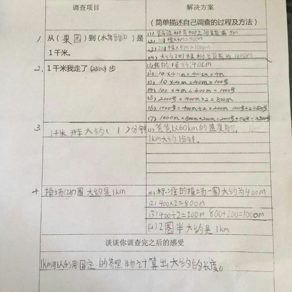 数学作业是课堂教学的延伸和拓展,是对数学知识的的巩固和运用,是小学数学教学的重要组成部分。著名教育家陶行知说:教学做要合一,在做上学,做是学的中心。因此,在数学教学过程中,根据教材特点,多为学生搭建实践活动的平台,让学生在实践中学习;在实践中合作;在实践中创新是很有必要的。基于此,在清明小长假期间,二年级数学组给孩子们留了一个有意思的数学实践作业“体验一千米有多长”。