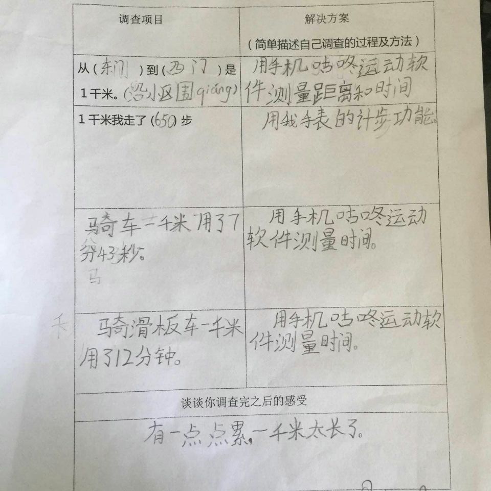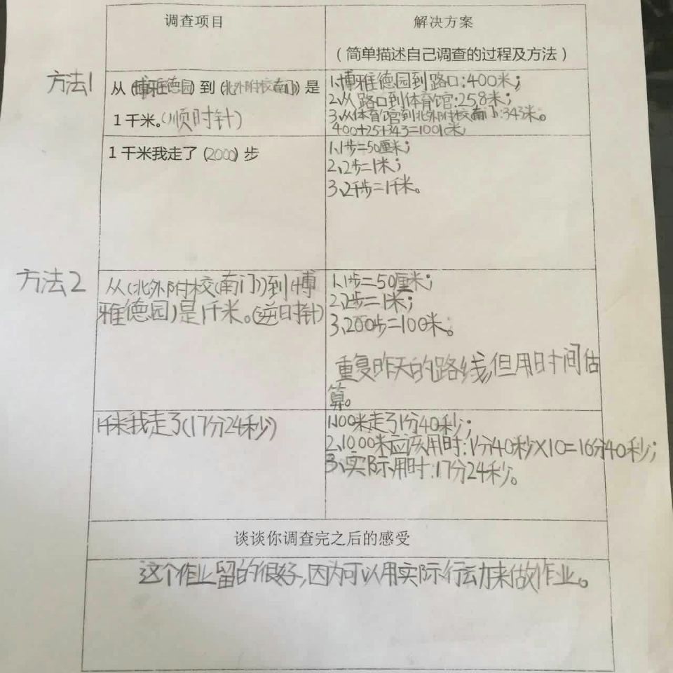 面对这样的实践作业,孩子们都觉得特别有意思,每一个同学都用自己的亲身经历体验到了学习数学的乐趣,孩子们惊奇地发现原来一千米跟自己之前想象的大有不同:有些同学在调查之前觉得一千米等于1000米,有1000个一米长应该很长很长,而通过本次数学实践作业调查后,发现家附近的超市离自己家大约就是一千米,原来一千米没有想象的那么远,爸爸开车的话甚至一分钟就开到超市了,原来开车一分钟就可以走完一千米呢。有些同学在调查之前觉得一千米大概只有操场的三圈,应该不会太长,但自己步行一千米之后发现走一千米的路真的很累。孩子们通过亲身感受,在生活中重新认识了一千米,并且将数学知识与生活实际紧密结合,从而真正感受到了学习数学的乐趣与意义。