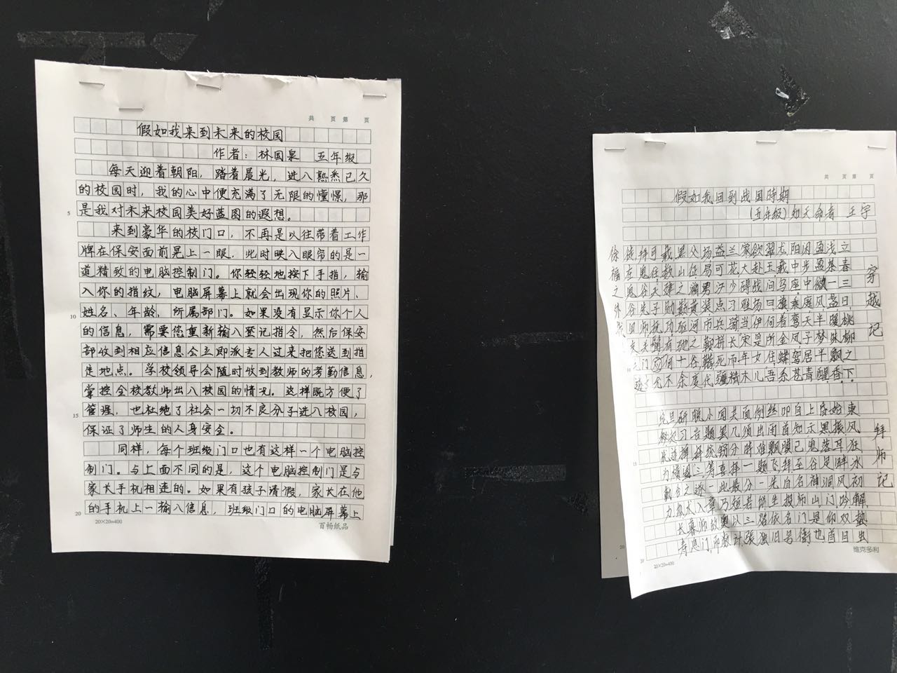 全体语文组教师认真对待此次想象文写作活动,不但将当时的限时作文重新润色修改、并认真誊写。展板上所呈现的一篇篇作文,不但文采斐然,并且字迹工整。尤其是王宇老师的古文写作《假如我来到战国时期》徜徉恣肆、行云流水,充分展示了语文教师扎实的基本功底,也给学生起了良好的示范作用。