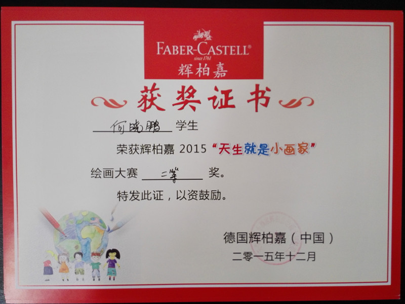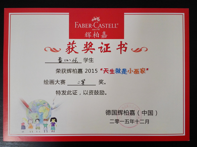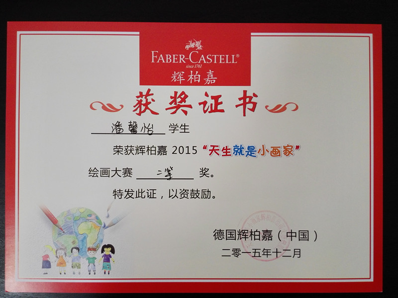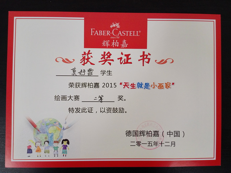 2015年12月,我校小学美术组和预科美术教师带领并辅导学生参加了由德国辉柏嘉(中国)举办的“天生就是小画家”全国绘画大赛,在小学和预科美术教师的精心指导下,取得佳绩,共有45人获奖。其中,二等奖6人,三等奖14人,入围奖24人,辅导老师贡献奖1人。预科16人获奖。本次比赛获奖是对我校艺术成果及教师工作的极大肯定,我们将再接再厉,争取更多的荣誉!