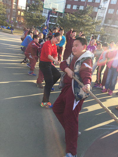大课间体育活动的项目既有广播操、武术操、武术基本动作以及校园自编操等集体活动也有踢毽子、跳绳、踢足球、打篮球、拔河等阳光体育活动。学生们热情高涨,劲头十足,兴趣浓厚,学生们的欢心愉悦将美丽的校园装扮的更加美丽,赋予了校园无限的生机与活力。老师们也情不自禁地加入其中,和学生们一起锻炼,一起欢笑。