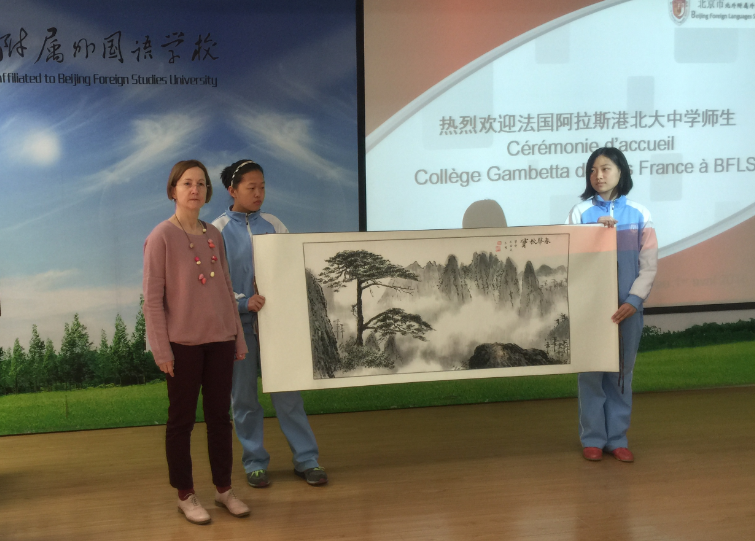 随后,法方学校两名学生代表用流利的中文发言,对我校真诚而周到的接待表示感谢,并赠送了介绍阿拉斯城市历史的书籍。我校为港北大中学赠送一幅中国山水画,画中的青松象征着我校与港北大中学两校友谊长青。