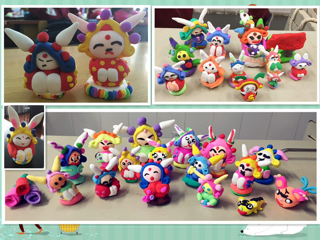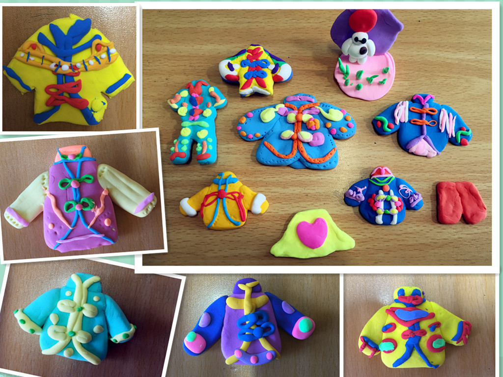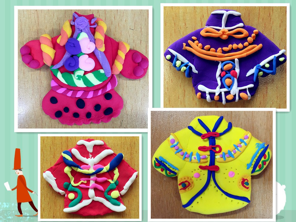 与此同时,我还让学生了解、学习、捏制了中国最具代表性的传统服饰——唐装。我国传统服装的代表——满式“唐装”是中式服装的统称,这种“唐装”是由马褂演变而来的,其款式结构有四大特点:一是立领,二是连袖,三是对襟,也可以是斜襟;四是盘扣。这种“唐装”不是唐代的服装,而是改良过的马褂,是现在中国的代表性服饰。通过捏制唐装,学生们对中国传统服饰文化有了更深刻的了解,或许他们之中就有未来的服装设计师,在不久的将来传承和发扬着我们中国的传统文化呢!