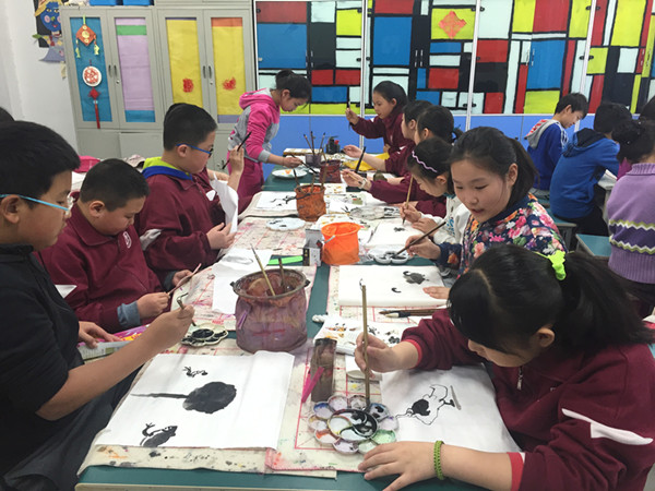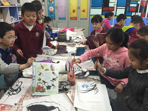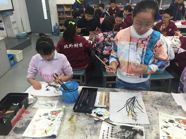 国画一词起源于汉代,国画是汉族的传统绘画形式,是中国的国粹。自古“书画同源”,书法和国画不分家,互为基础。五年级了,孩子的书法和绘画都有一定的基础,这学期的国画在墨色的运用的基础上,增加了难度和题材:有花鸟,山水和人物。这么传统文化底蕴带给孩子们是不一样的乐趣和体验。看孩子们画的多么认真,有趣。