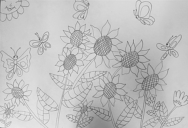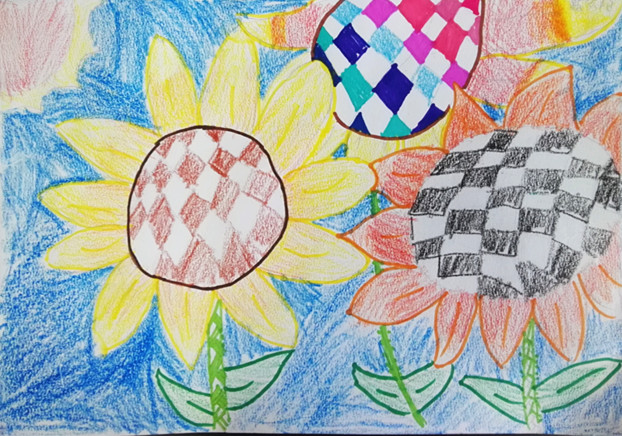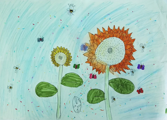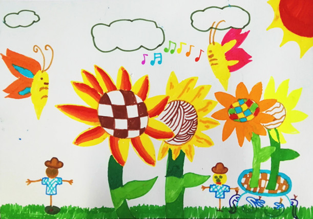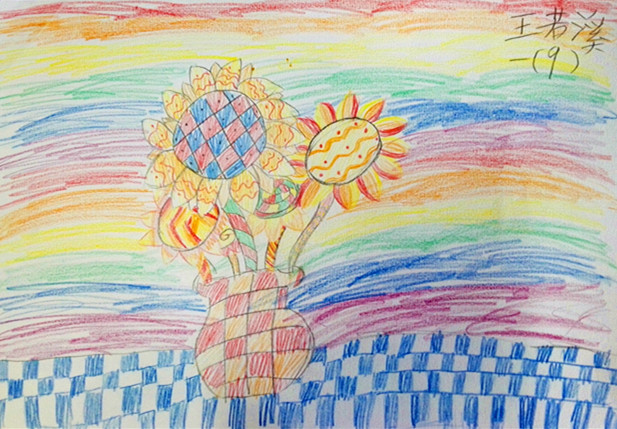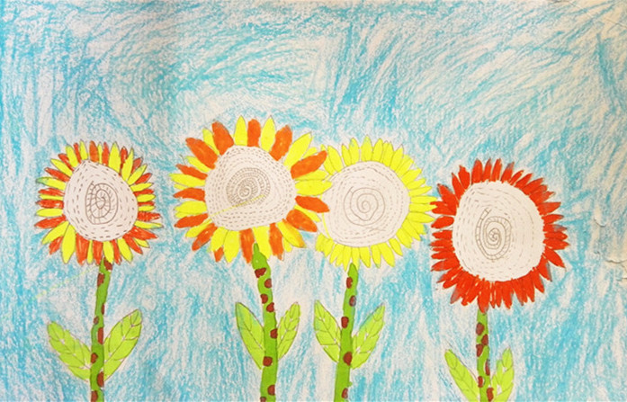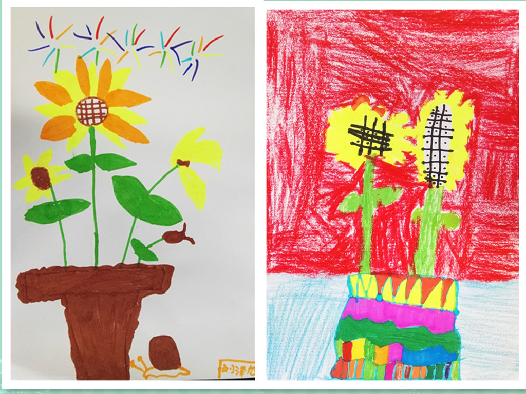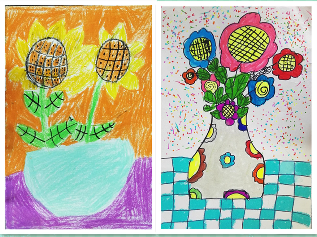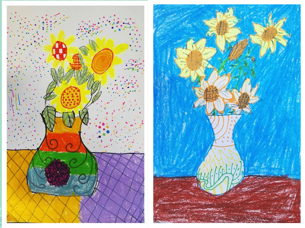 向日葵的花语是乐观勇敢、欣欣向荣,面对阳光永远绽放笑容,课上学生们通过欣赏大师梵高名作《向日葵》,感受作品亮丽的色彩和独特的笔触。在经典中汲取艺术的养分,同学们也画出了自己心中的向日葵。