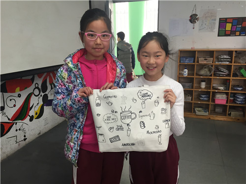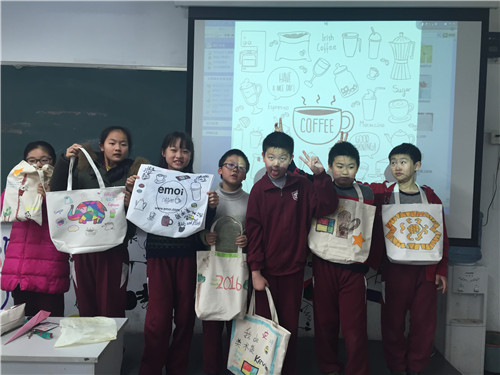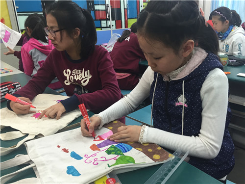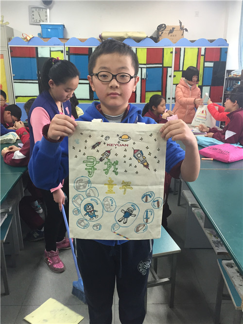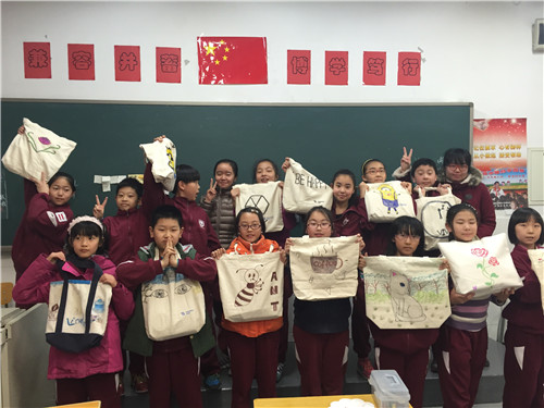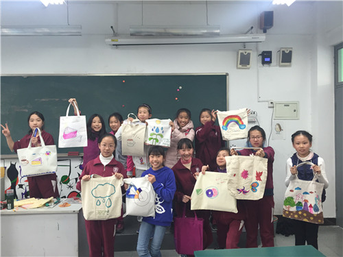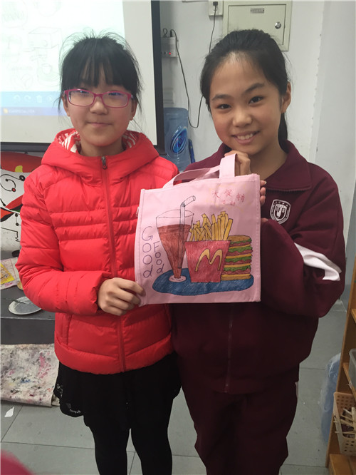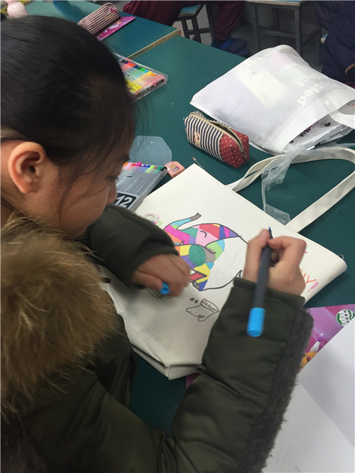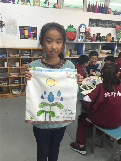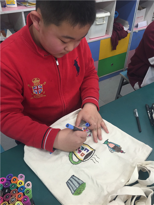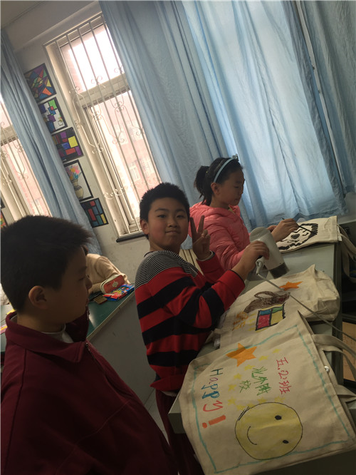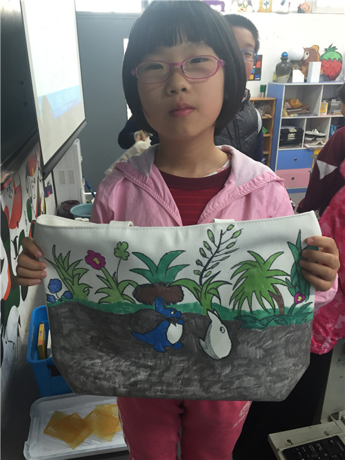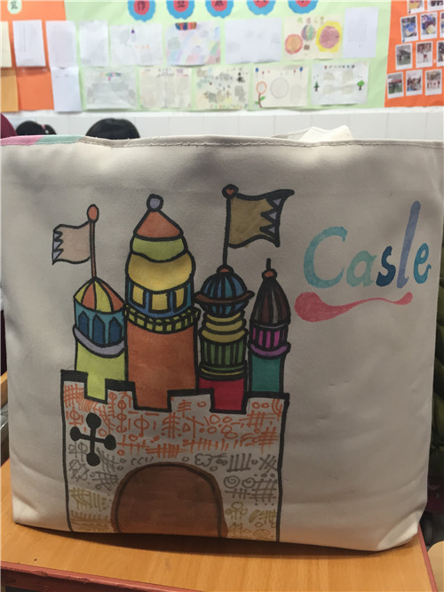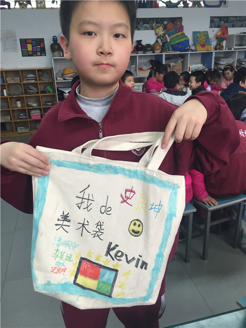 画完的布袋就是我们的专用美术袋啦,这样走起路队来也会成为校园里的一道风景!