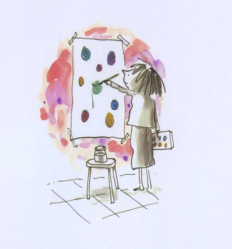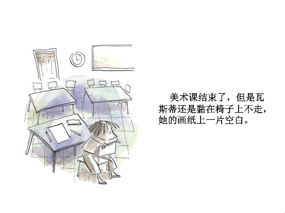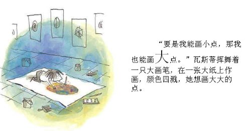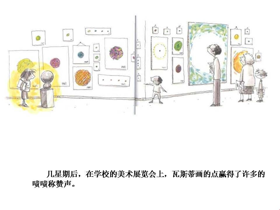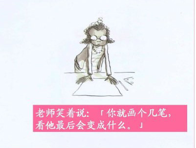 李老师用绘本“点”的故事告诉了我们要如何做。课堂上有一个孩子不会画画,老师教育他说:“孩子没事儿,你就随便画个几笔。”于是孩子颤抖的画了一个“点”,老师看了看并没有说什么,但是让孩子写上自己的名字。几天之后,孩子发现自己的那副作品“点”正挂在了老师的办公桌上,并且还镶嵌在金色的涡型画框里。孩子想了想:“我可以画的更好嘛!”于是孩子开始画,他发现蓝色和红色混合在一起可以弄成一个紫色的点......我可以画小点也可以画大点......他越画越厉害,最后在美术展览会上,他的点得到了大家的赞赏。同样,他用实际行动帮助了另一个不会画画的孩子。这告诉了我们每一个学生都是有天赋的,每个孩子都是不同的。我们要擅于挖掘他们的才能,君子豹变可能只是一瞬之前,给孩子画作上一句贴心的评语,一句赞赏鼓励的话,或许都可以帮助他们改变自己。