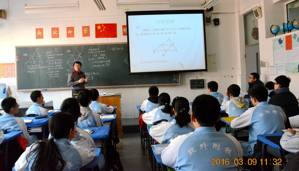3月9日上午第4节课,我校骨干教师杨磊老师在初二(4)班做了一节精彩的示范课——《三角形的中位线》。这一教学内容不仅是初中数学知识点中梯形中位线的基础,也是证明线段平行和线段倍分关系的重要的方法和依据,在整个知识体系中占有相当重要的地位,起到承上启下的作用。杨老师以平行四边形的有关知识为基础,通过“原命题与逆命题的关系”引出三角形中位线的内容,进而探索研究三角形中位线的性质,最后利用性质定理进行有关应用,教学环节步步衔接,层层深入,体现知识的系统性。