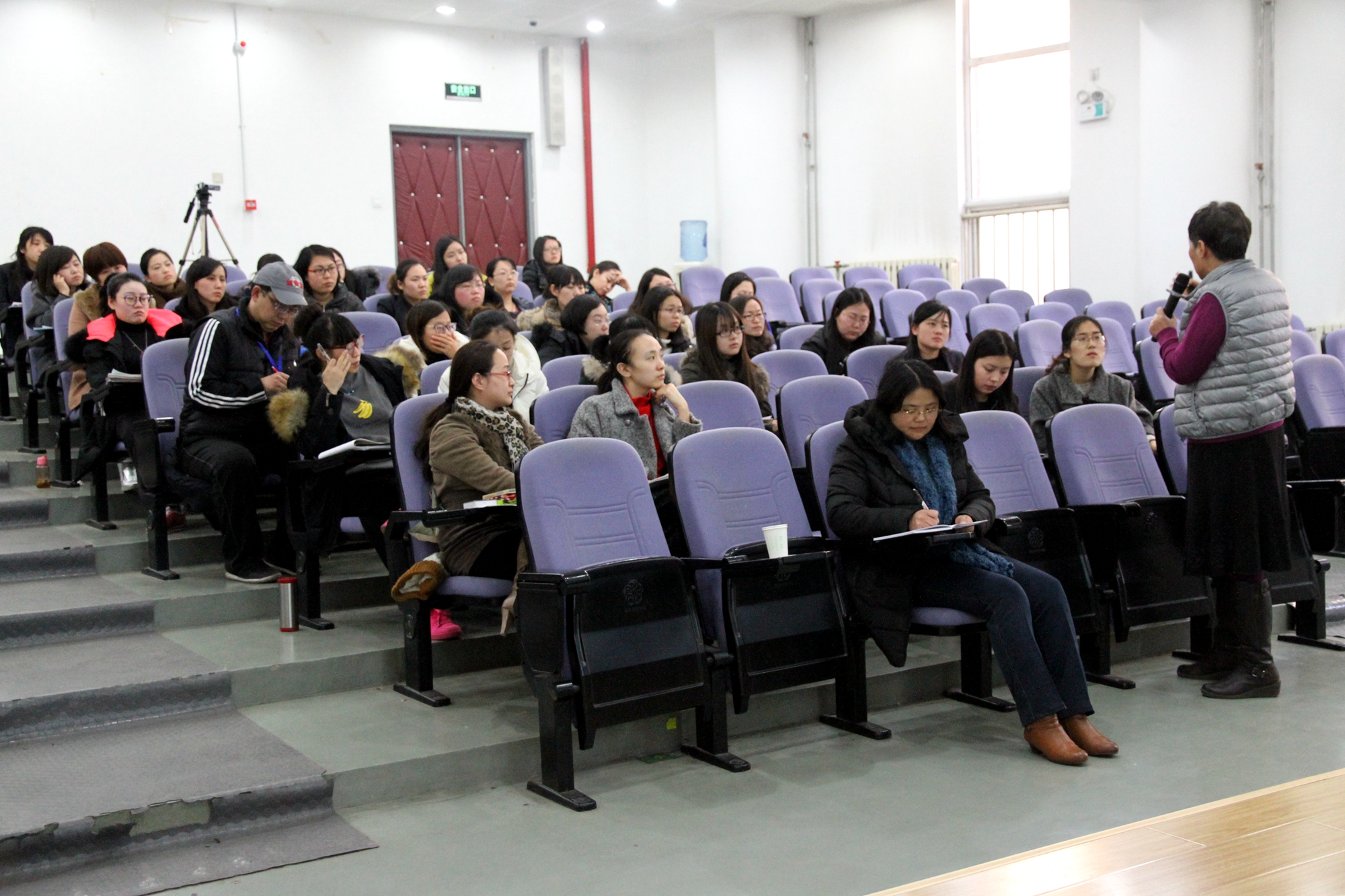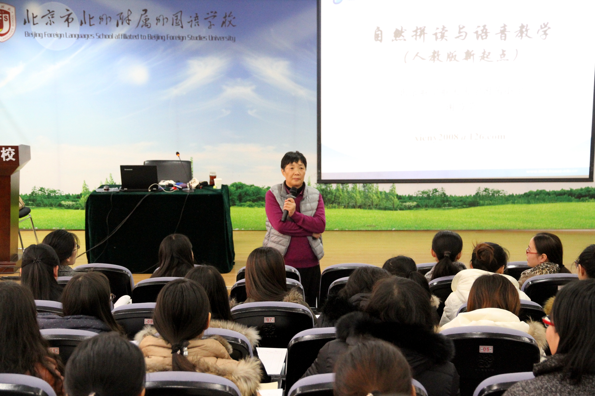 谢乃莹老师以人教版新起点课本为背景,以《自然拼读与语音教学》为主题展开讲座。在讲座的伊始,谢乃莹以 “什么是phonics?”引发老师们的热烈讨论,紧接着她又以我国现在的英语语音教学所面临的问题和学生们记忆单词的困境,说明了语音教学和自然拼读的迫切性和重要性。她在讲座中指出:语言和英语表音文字的特性,以及英语文字音形不一的特性决定了语音教学的重要性。应该从学生开始学习英语就实施语音教学。小学阶段应该把听,说,阅读放在更加重要的位置。同时谢老师还从什么是自然拼读,Phonics在英语学习中的意义以及Phonics的大致学习过程和各阶段的相关练习,给全体小学英语教师体进行了有关自然拼读的系统培训。讲座的最后,谢乃莹从自然拼读法学习要素的讲解将理论知识落到实处,并且给老师们介绍了很多可利用的语音教学资源,如Bob Reader,瑞格英语,Phonics Kids等学习资源。