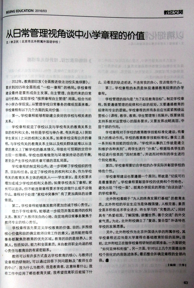 《北京教育》2016年3月版刊登了北京外国语大学校长助理、北外附校校长林卫民文章,题目为:《从日常管理视角谈中小学章程的价值》。全文如下: