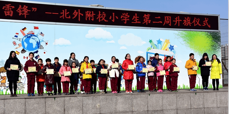 升旗仪式上,学校对在海淀区计算机比赛获奖同学进行了表彰并颁发奖状,口头表扬优秀班集体,小学副校长孟娜和教学主任李琳为获奖学生颁奖并合影。