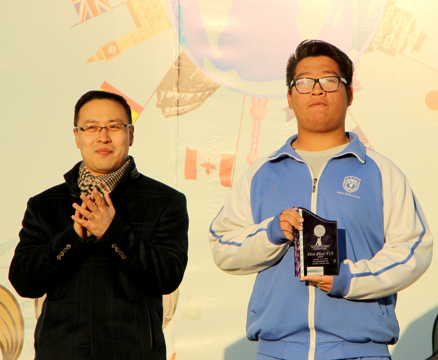 升旗仪式最后我校校长助理王静、高中校区校长助理刘长虹为在海淀区金鹏科技论坛比赛中获得一等奖的同学颁奖;副校长、副书记高雁鸣为在北美国际航天模型类比赛中获得金奖的刘梓宸同学颁奖。