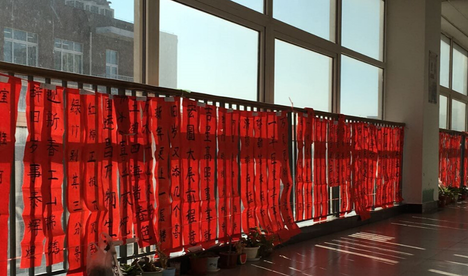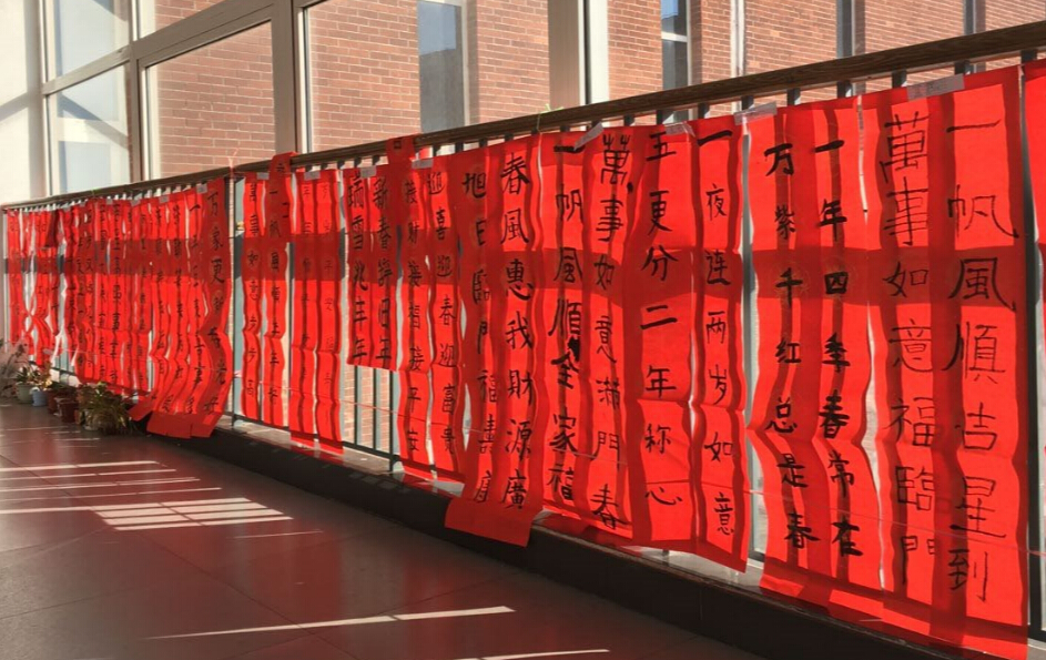 红红的对联不仅装饰了学校的走廊,给萧条的冬日增添了些许春意,还让学生在实际生活中感受到了语文的魅力。借着对联,师生们在春节的尾声中回味着年味儿,更觉时光可贵,只有努力奋斗才能不负来年的收获,才能不负这满目的春光。