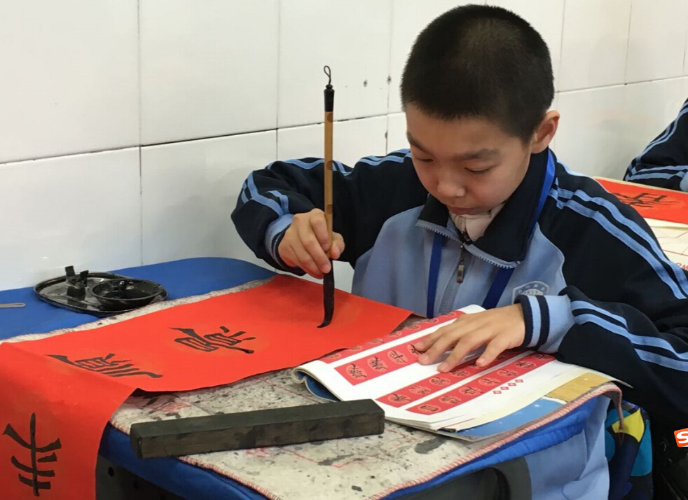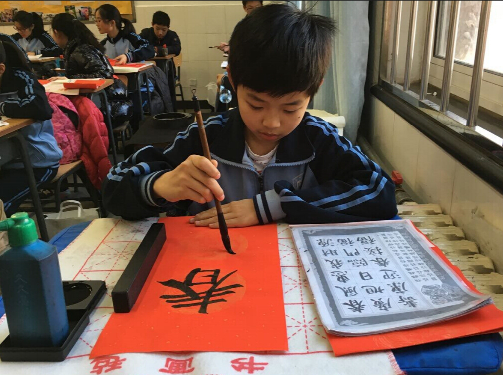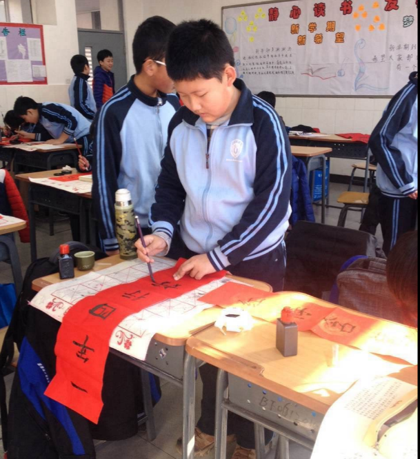 经过寒假的积累和准备,同学们早已准备好笔墨纸砚,各个跃跃欲试,准备一展自己的风采。分纸,借墨,提联,在活动中同学们互帮互助,互相指点,既积累了经验,体会了软笔书法的乐趣,更在对联中表达了各自的美好愿景。有不少同学在欣赏完别人的对联后,在羡慕中懊恼,感慨自己平时没有把字练好,同时生起了练好书法的欲望,争取明年春节家里能挂上自己写的春联。