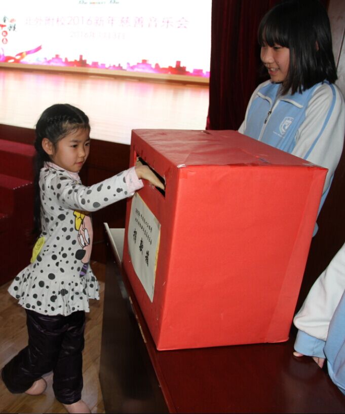 践行慈善是此次活动的核心内容和宗旨。本次音乐会以实名出售门票和接受捐助的形式募集善款。为此,学校早在12月份便面向全体初中生发出倡议。在初中学生自主管理委员会的共同努力下,此次活动得到了学生和家长的响应,共售出门票款3200元,共收到捐款2796.5元,合计5996.5元。晚会现场由自管会主席初二(5)赵苑辰同学将善款全部捐献给北京顺义太阳村的同学们。