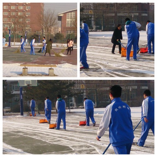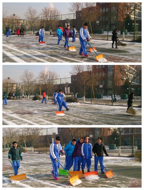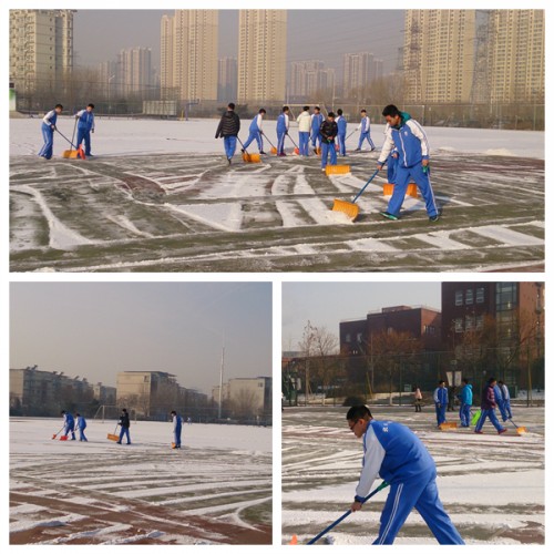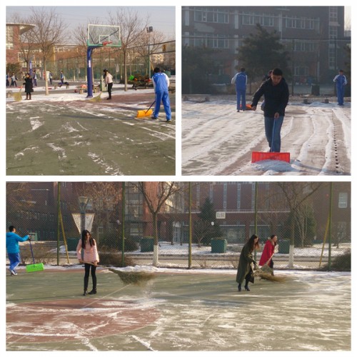 但是这些阻挡不住同学们爱运动的热情,28日上午大课间,高一全体任课教师和篮球爱好者一起到操场打扫篮球场的积雪,大家团结协作,干劲十足,有的扫雪,有的铲雪,经过半个小时的奋战,将篮球场上的积雪打扫得干干净净。师生同心协力开辟出一片学生自由活动的乐园,形成了这个冬季里最美的风景线!