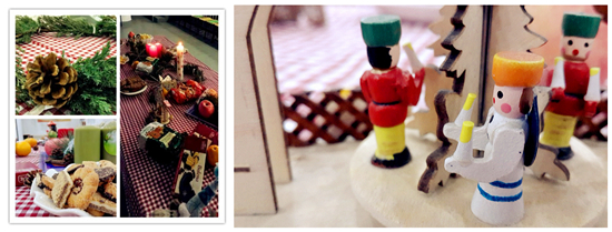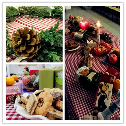 晚饭后,18:00,活动准时开始。家长、学生陆续进入会场,首先映入眼帘的是布满蜡烛和德国传统饰物的欧式餐桌。桌子上严格按照德国人的习惯,布置着烛台、热气风车、香薰、桂皮、栗子和降灵花环。代替圣诞大餐的,是一些德国的点心和巧克力。