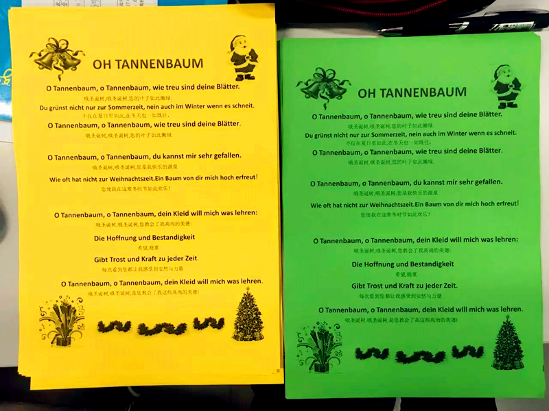 入座完毕,外专 Jessica 和廖沧龙老师一起对德国的圣诞节做了简单的介绍,外教 Danila 分享了传统和现代的圣诞歌曲,并教全场的同学一起唱了经典的圣诞颂歌 Oh Tannenbaum (《啊!圣诞树!》)。接着,学生们自由活动,上前品尝圣诞点心,并阅读贴在墙上的有关圣诞节和德国文化的小知识。品尝由外教和老师们一起制作的德国传统饮品 PUNSCH (一种由混合果汁和新鲜水果、调料等煮成的热饮,在圣诞集市上非常受欢迎)。