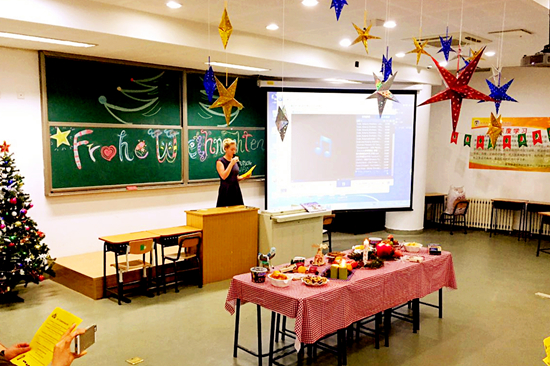 12月23日下午,学生还在上课,复语组的老师们在录课室里忙碌的布置着圣诞体验活动的会场,欢声笑语,充满着节气的气氛和对活动的期待,因为初高中德语组第一次合作举办的“圣诞文化体验课”将在这里举行。届时,初高中全体德语师生欢聚一堂,聆听我校德语专家 Jessica 介绍德国人是如何度过这一欧洲传统节日的。