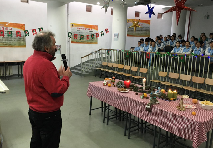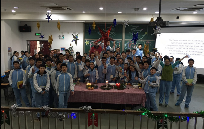 之后,Jochen Settili老师又来到了初一年级的德语课堂,给初一的同学们介绍了德国的圣诞假期,Settili老师的两位儿子分别就读于德国中学和北京德国使馆学校,他们也与同学们进行了交流,回答了许多关于德国学校、作业、假期以及课外学生课外活动的问题。