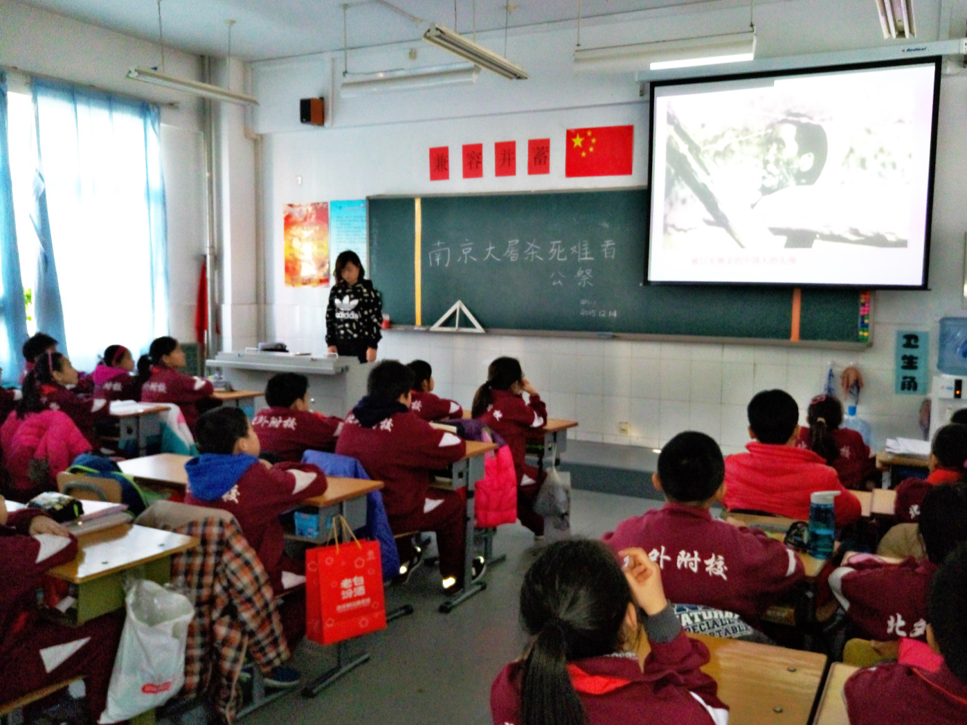 为了让同学们了解南京大屠杀,各班主任用图片、音像资料给同学们讲述了1937年12月13日,日本侵略军侵占南京后,进行了40多天的血腥屠杀,杀害中国平民和被俘军人达30余万人。随后组织学生对历史告诉我们什么道理以及我们该做什么进行了讨论。同学们积极发言,各抒己见。