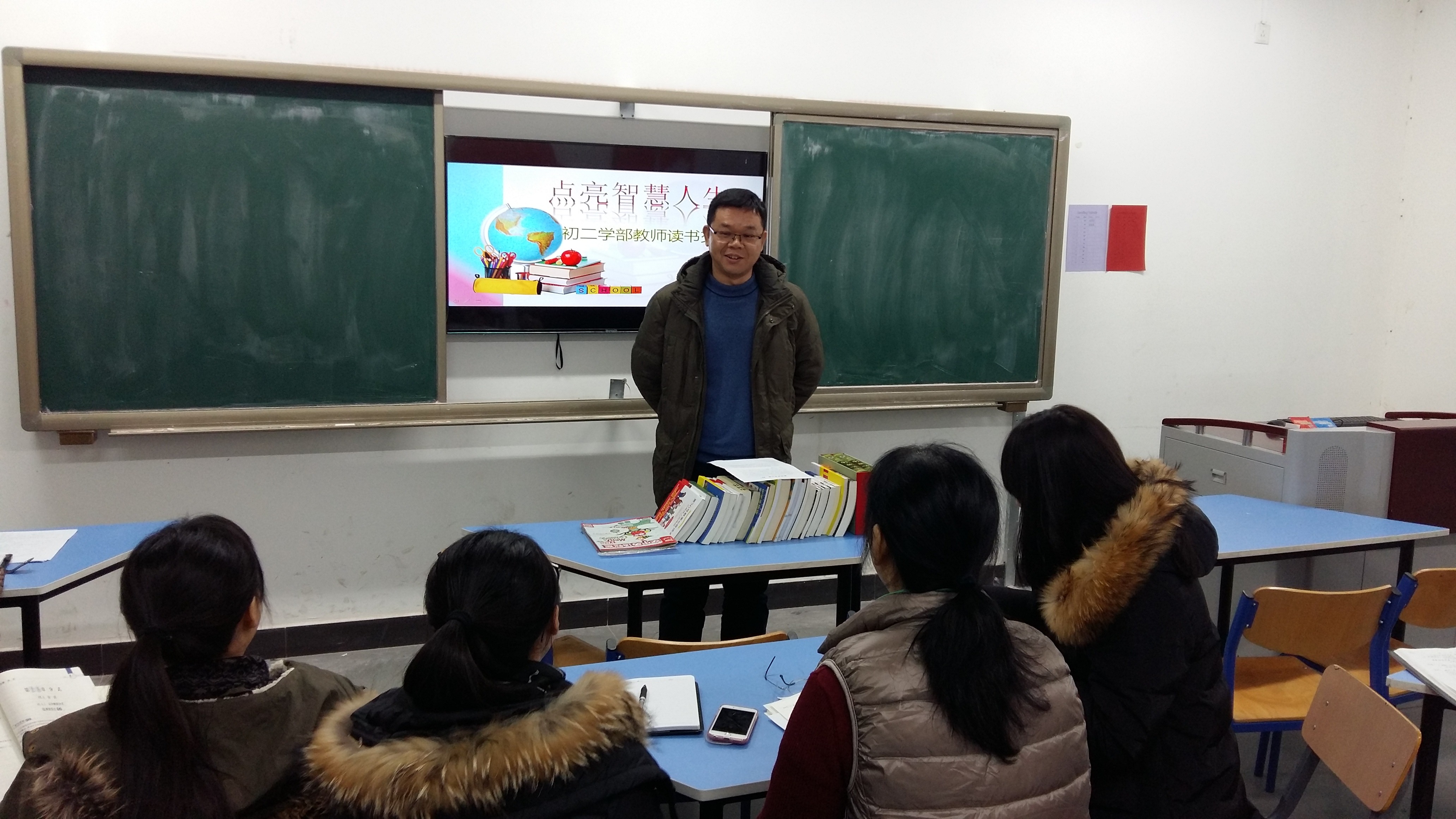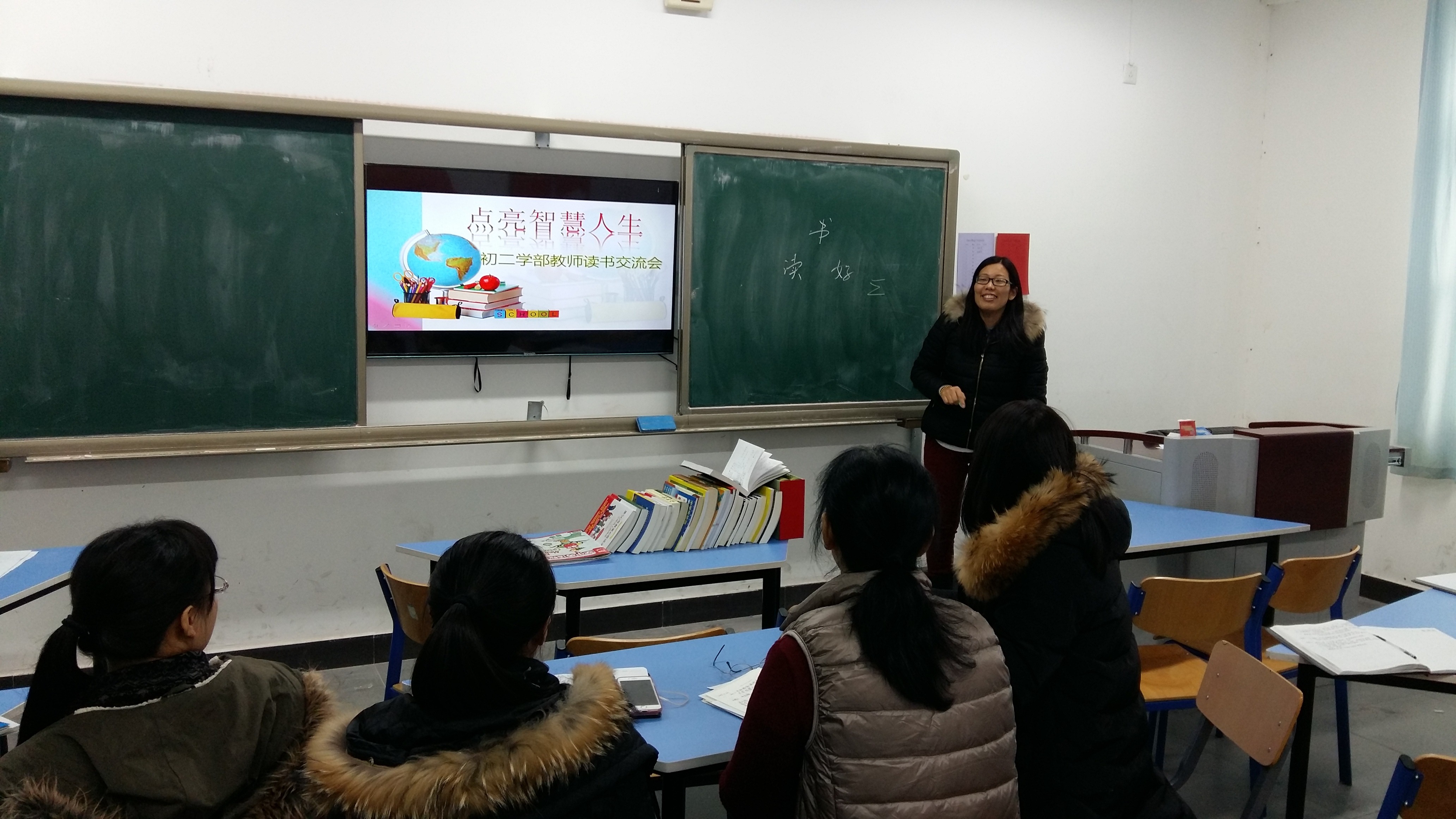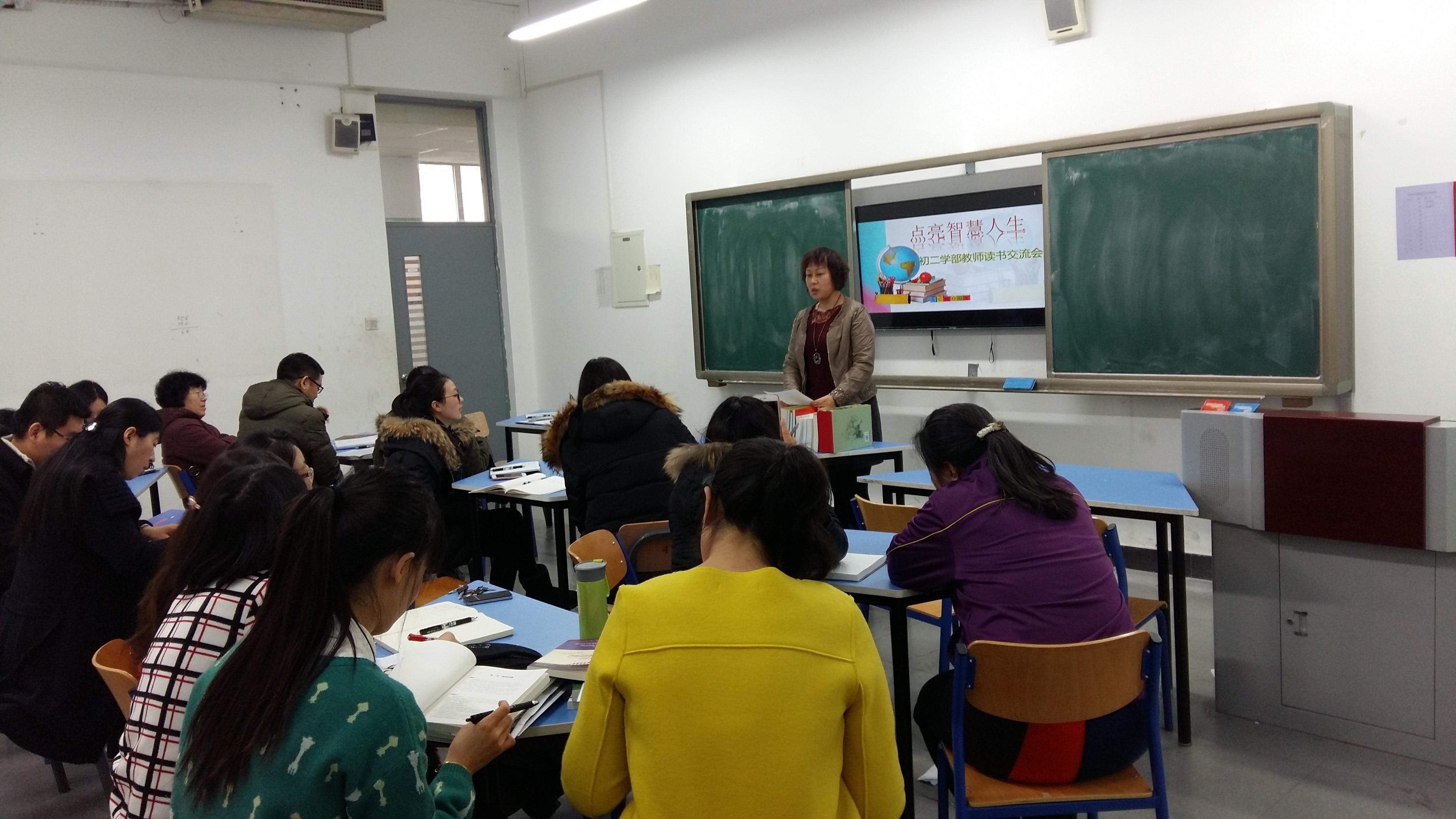 书籍是人类智慧的结晶,在校工会组织的读书活动中,初二学年全体教师在年级主任闫亚军的组织和带领下,积极开展读书活动,并各有读书心得与体会,与11月30日开展了以“点亮智慧人生”为主题的读书交流活动。初二年级全体教师参加,语文教师申冬梅老师主持。