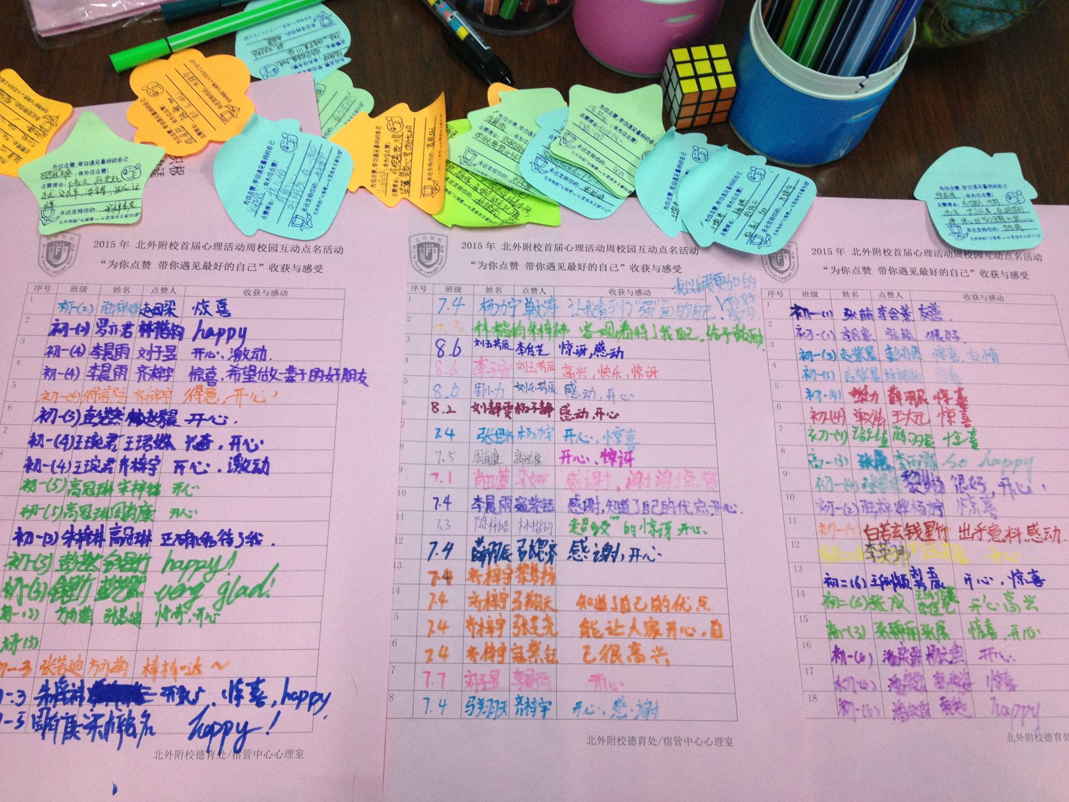 本届心理周活动形式多样、内容丰富,深受同学们的喜爱。其中校园大型互动点名活动“为你点赞,带你遇见最好的自己”用“点赞卡”的签写、赠送形式,表达对他人的欣赏,引导学生们体验欣赏带给人的温暖与力量。点赞活动由心理社团成员发起,通过对卡片发放形式与感悟登记的巧妙设计,有效地引发学生主动积极参与,活动期间发放点赞卡2000余张,短短5天时间,吸引300余名学生主动来到心理室参观体验,对我校心理室新址功能设施起到了积极的宣传效果,点赞活动将会自心理活动周起一直在各校区年级组、宿管中心、心理社团活动中延续下去,传递赞美的美德,用温暖鼓舞的积极关注营造温馨和谐的校园氛围。