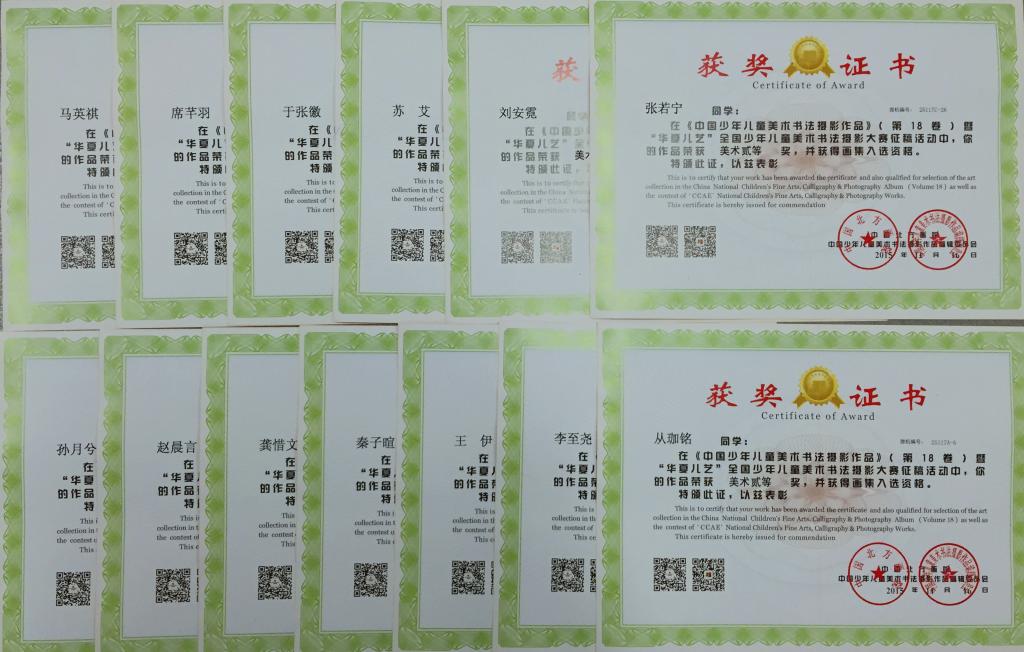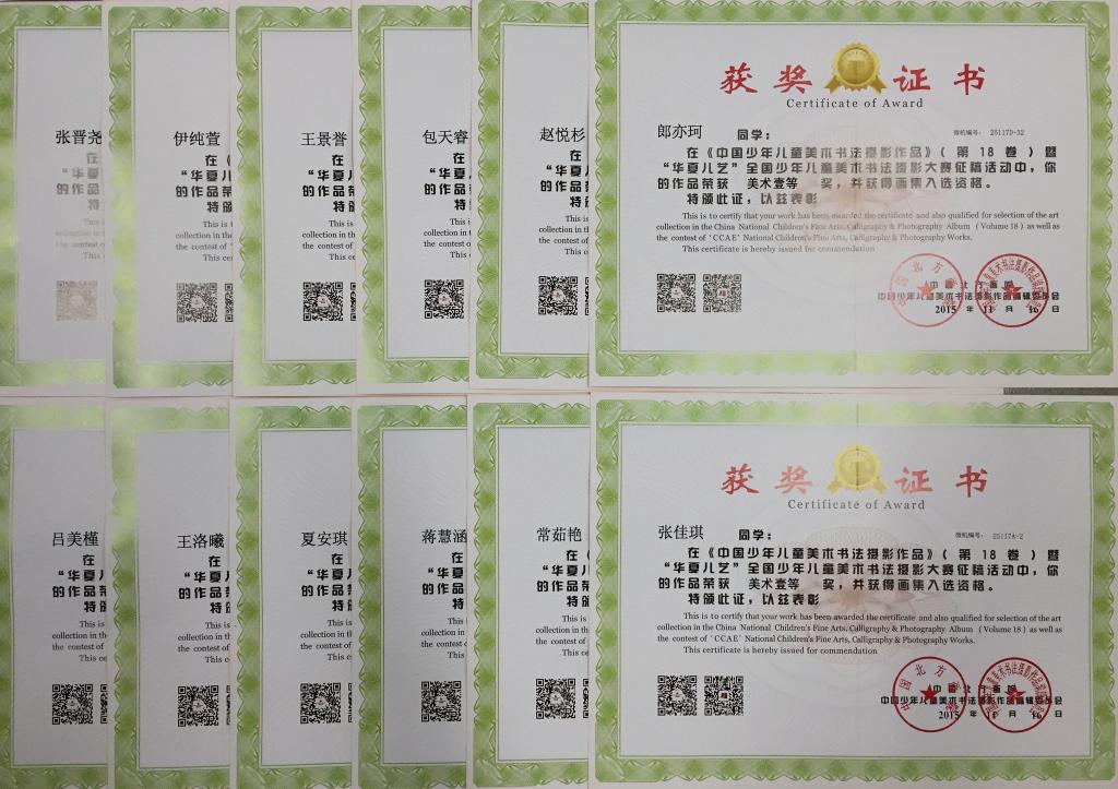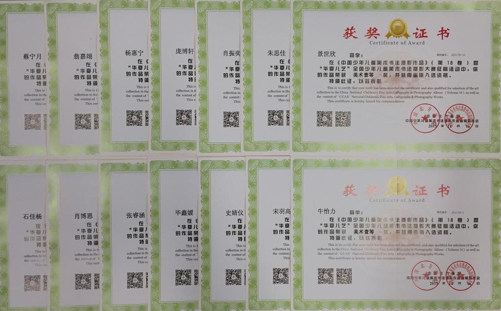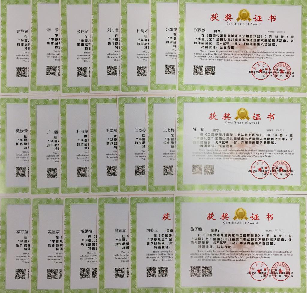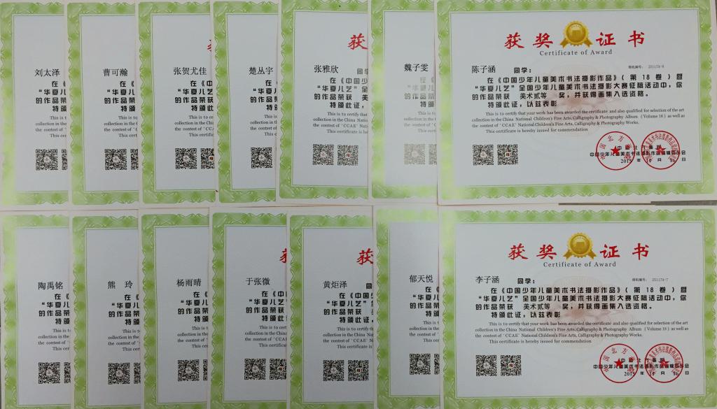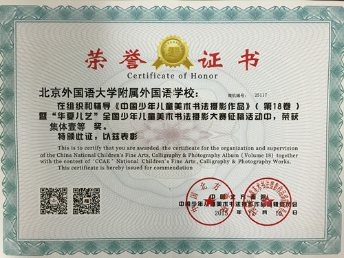 本学期我校小学美术组的老师带领和辅导学生参加了“华夏儿艺”全国少年儿童美术书法摄影大赛,共有109名同学获奖。其中,美术作品一等奖获奖26人,二等奖获奖47人,三等奖获奖26人;书法作品特等奖1人,一等奖3人,二等奖2人,三等奖3人。黄海锟、王芳、王晓、耿欣楠及张牧村老师获得了优秀辅导教师奖;北外附校荣获集体一等奖。这次比赛获奖是对我校及老师们极大的肯定,我们会带领学生再接再厉,争取更多的荣誉!