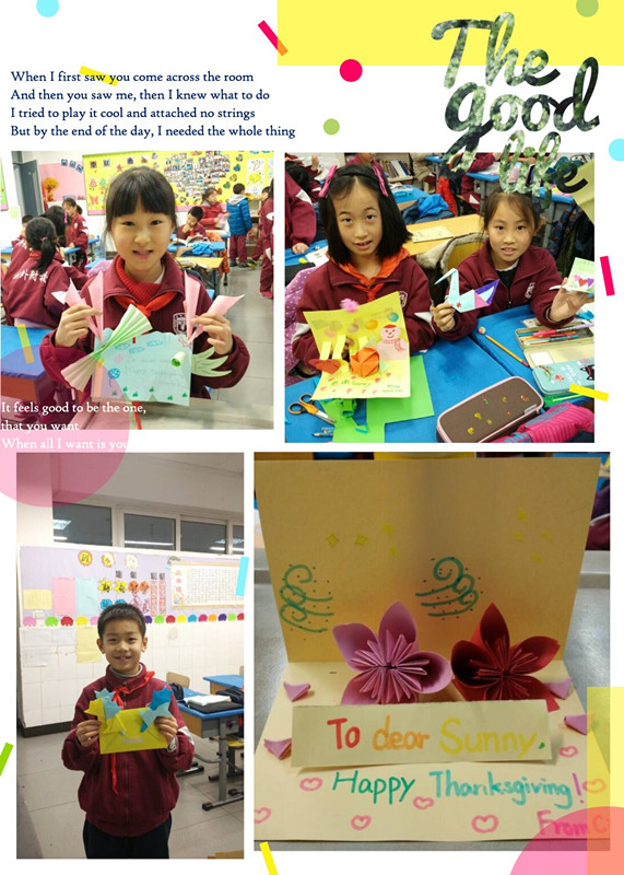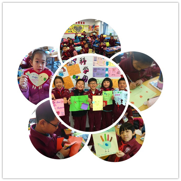 英语课上,老师们向孩子们讲述“感恩节”文化,从感恩节晚宴上的传统菜——火鸡,到“Thanksgiving”每一个字母都有其特殊的含义,孩子们听得津津有味。紧接着,老师们教孩子唱起了感恩歌曲《Happy Thanksgiving》。伴随着欢快的旋律,孩子们也想通过手工制作的方式表达自己的感恩之情。他们制作“感恩卡”,送上对老师、对父母、对朋友、对同学的感谢。虽然工艺简单,内容朴实,但礼轻情意重,小小的手工卡片传递着孩子们心间的感恩。