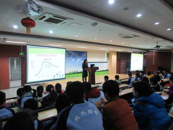 11月26日,初一年级组在主教楼二层阶梯教室开展了《遇见独特的我——生命成长教育主题讲座》,初二年级全体学生及班主任参加了本次活动。讲座由心理室李丹老师主讲,初一年级组长张霞老师主持。