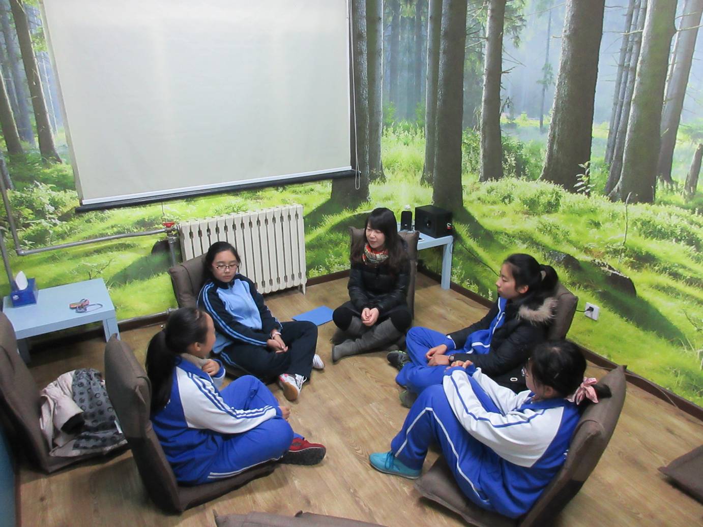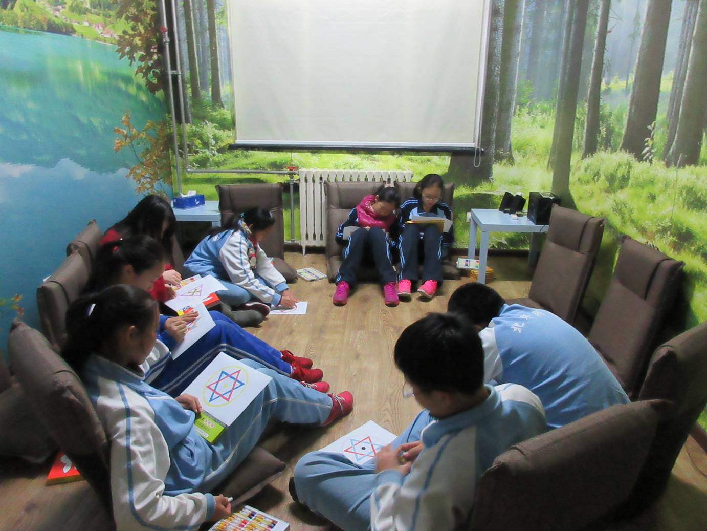 在“森林小屋”放松室优美的环境中,同学们席地而坐,伴随着舒缓的音乐,跟随徐可老师一起阅读图文并茂的绘本故事、跟随李丹老师一起通过冥想与自己内在的心灵对话、通过曼陀罗绘画、蜡笔彩绘表达抒发内在的声音,在沉静的团体氛围中与自己深处的心灵进行碰撞获得成长,在安全、放松、包容的团体氛围中分享生命经验与活动感悟,共同成长。