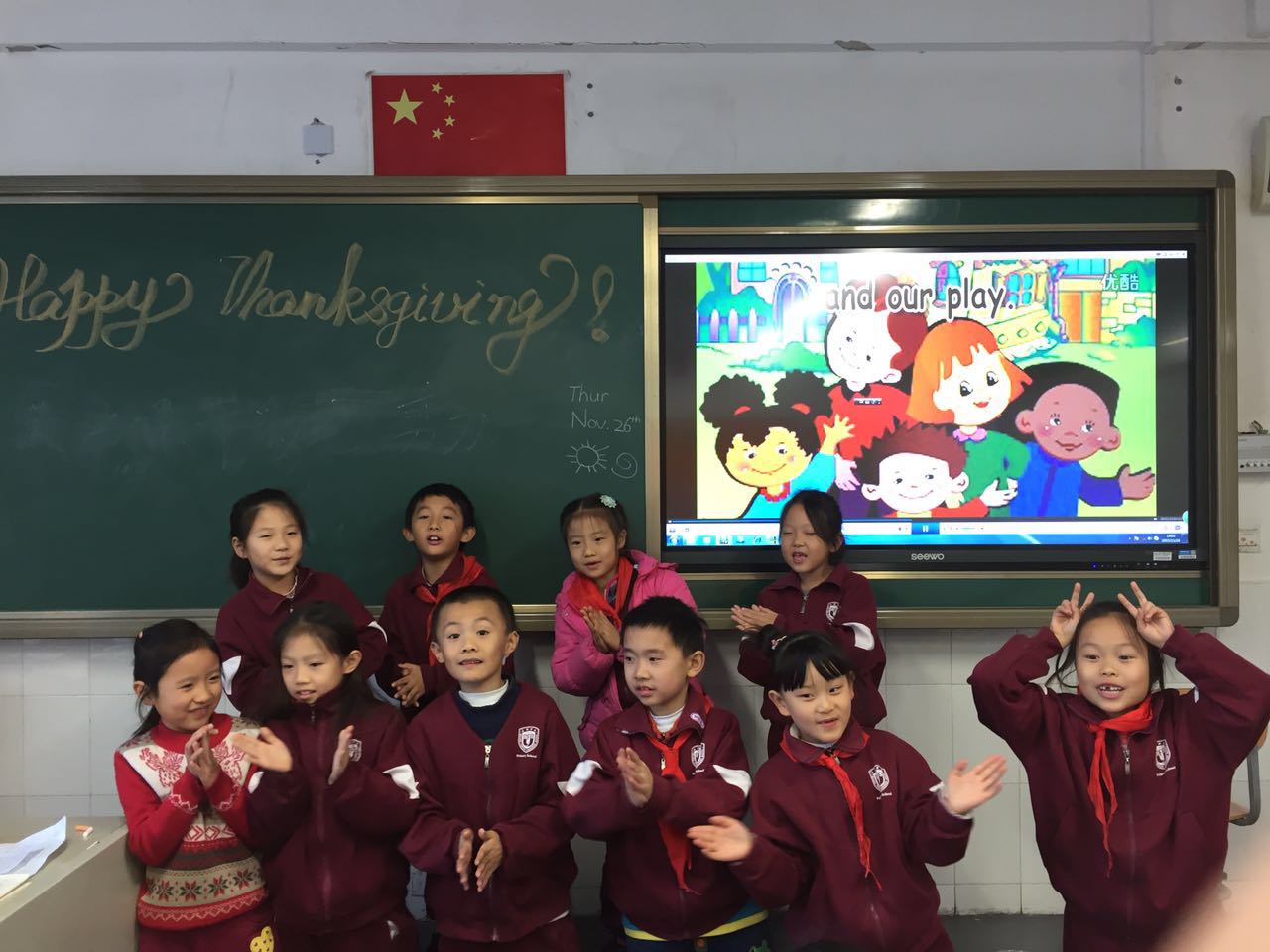 11月26日上午,小学二年级部英语课上举行了感恩节的活动。本次活动的主要目的是让孩子们知道感恩节的由来、了解感恩节的文化习俗、知道简单的英文表达、学唱感恩节的英文歌曲!为了使活动更有意义更加丰富,组内老师做了很多的准备活动,如感恩节由来的小视频、感恩节的英文PPT、英文歌曲“Thanksgiving Songs for Children”。在英语课堂上,一开始老师让孩子们先说说自己想要感激的人,并对身边的伙伴说一声感激并给与拥抱;接着老师们带着孩子们学习感恩节的相关知识,同时教孩子们现场设计并制作一本感恩节小书“Happy Thanksgiving Day”。通过此次活动孩子们不仅了解了感恩节的英文表达方式,也让他们懂得要怀有一颗感恩的心,感谢父母、感谢老师、感谢朋友及家人。
