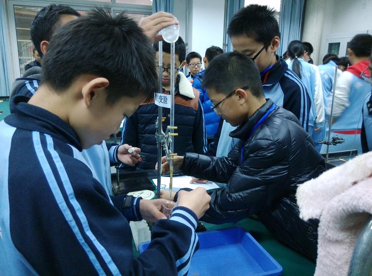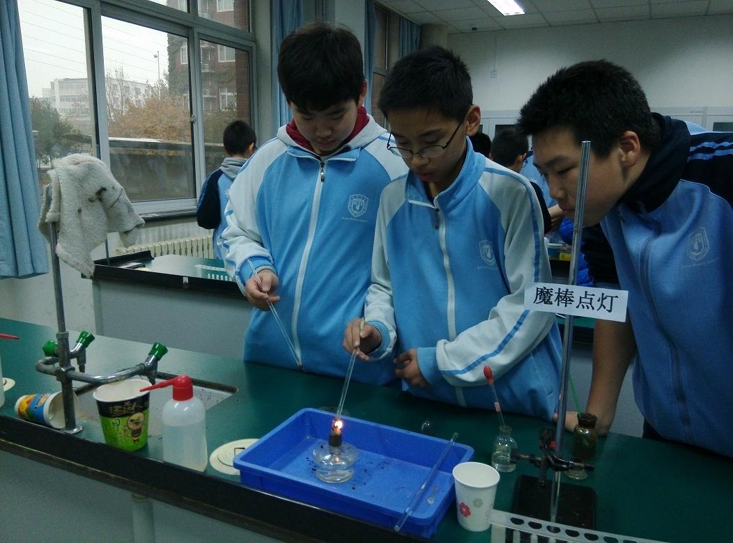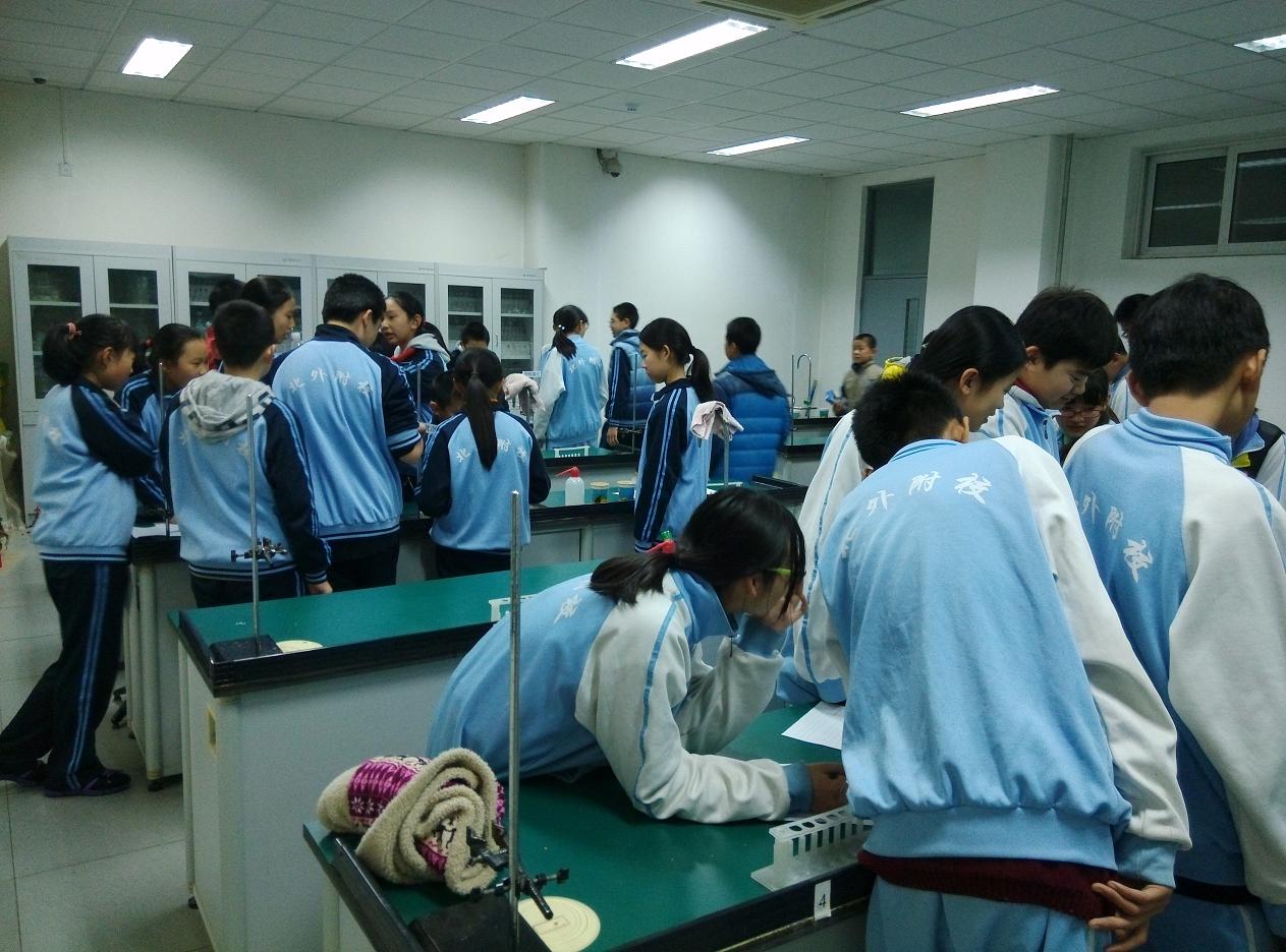 2015年11月16日北外附校初中部科技节拉开了帷幕。19日的中午科技活动之奇妙的化学之旅开始了,当天中午,初一初二的同学在化学实验室里进行了体验活动,化学老师和选修课的同学们给大家准备了五组实验:1、烧不坏的手帕2、指纹鉴定3、汽水的生成4、红酒变白酒5、磨棒点灯。同学们热情高涨,纷纷去体验,乐此不彼,久久不愿离开。